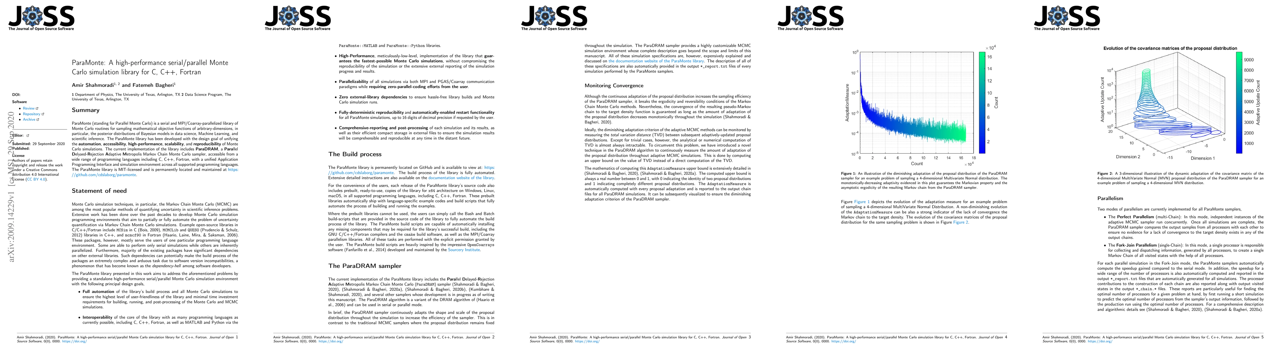ParaMonte is a high-performance Monte Carlo simulation library for C, C++, and Fortran, designed for efficient sampling of high-dimensional Bayesian models. It offers parallelized routines for automation, scalability, and reproducibility across multiple programming languages.