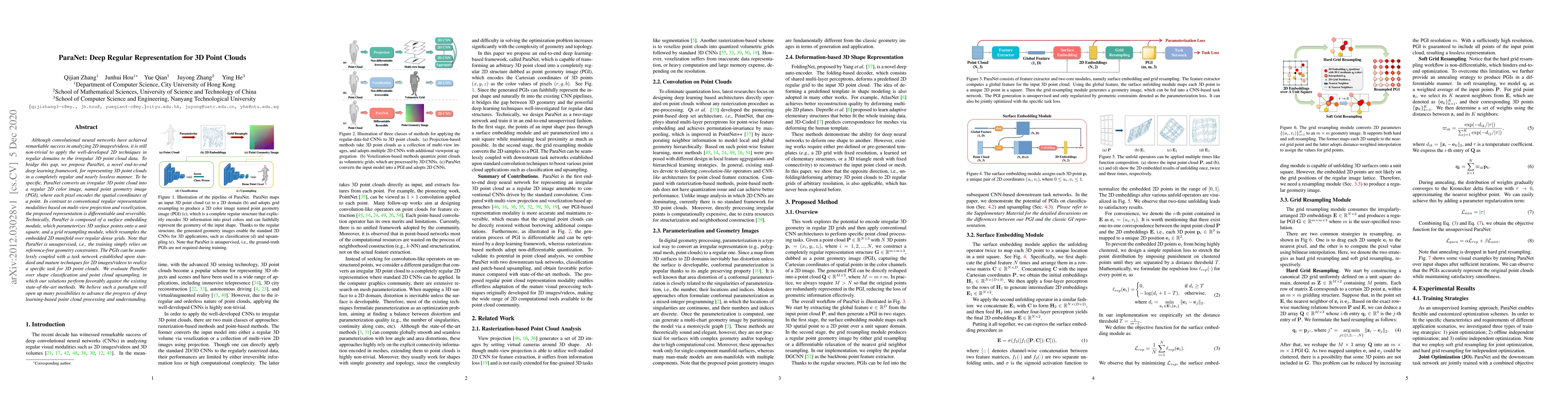 ParaNet proposes a novel deep learning framework to represent 3D point clouds as regular 2D color images, enabling the application of 2D techniques to 3D data. The method is unsupervised and achieves nearly lossless representation through differentiable and reversible transformations.