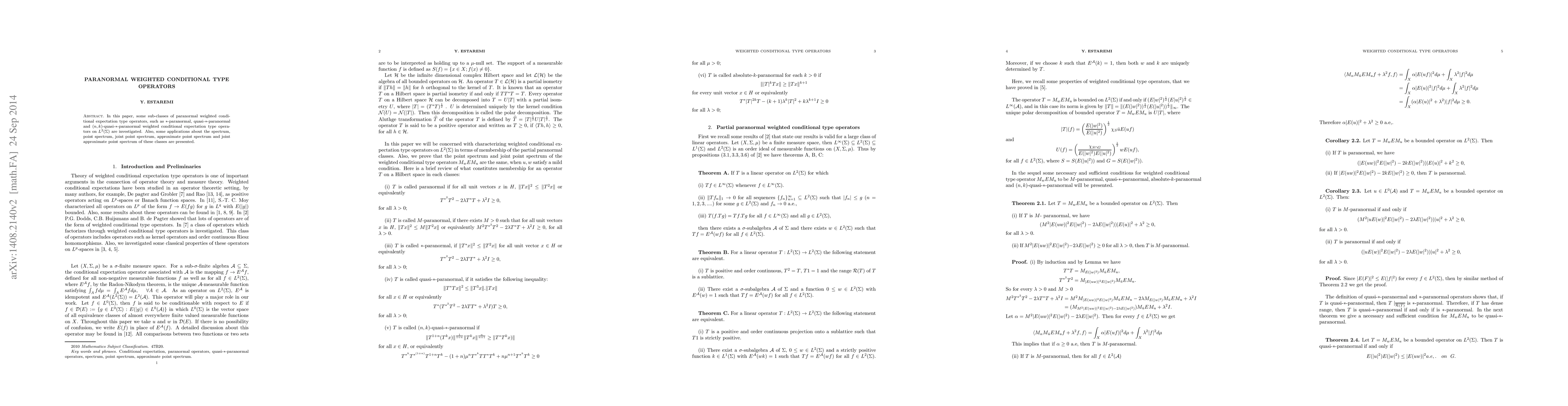 In this paper, some sub-classes of paranormal weighted conditional expectation type operators, such as *-paranormal, quasi-*-paranormal and (n; k)-quasi-*-paranormal weighted conditional expectation type opera- tors on $L^2(\Sigma)$ are investigated. Also, some applications about the spectrum, point spectrum, joint point spectrum, approximate point spectrum and joint approximate point spectrum of these classes are presented.