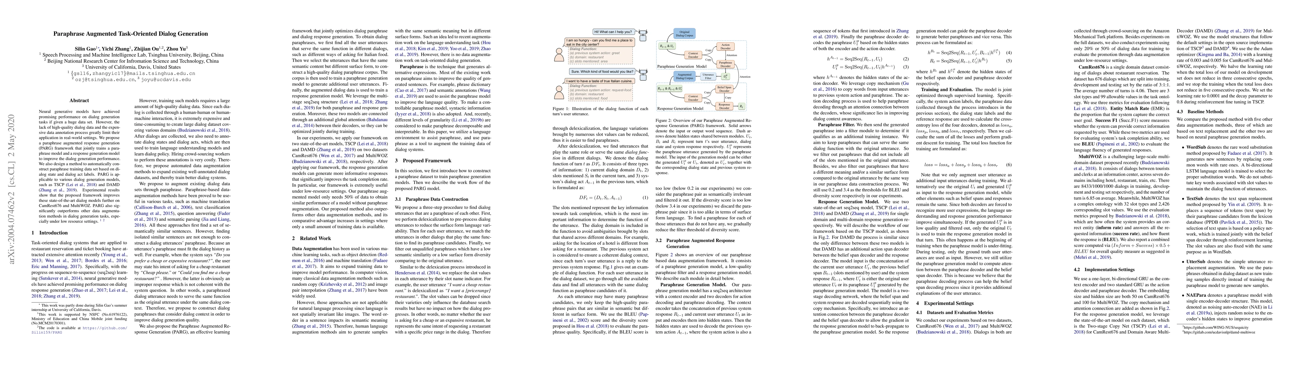 This paper introduces a Paraphrase Augmented Response Generation (PARG) framework that enhances task-oriented dialog models by jointly training a paraphrase model and a response generation model. The framework also automates the construction of paraphrase training data, significantly improving performance on datasets like CamRest676 and MultiWOZ, especially in low-resource settings.