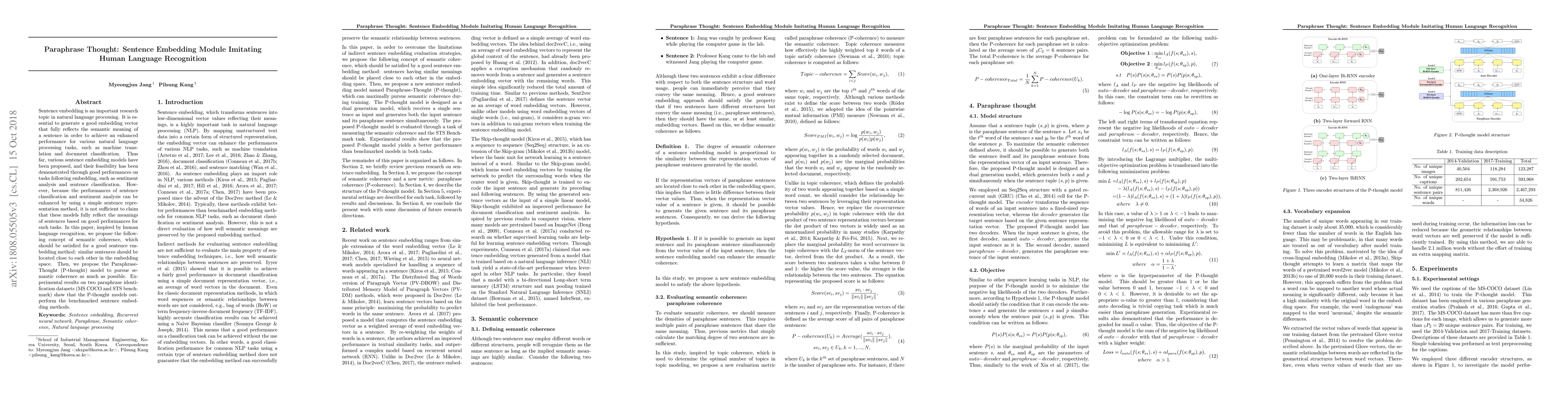 This paper proposes the Paraphrase-Thought (P-thought) model to enhance sentence embedding by ensuring semantic coherence, where similar sentences are closely located in the embedding space. Experimental results demonstrate that the P-thought model outperforms existing methods on paraphrase identification tasks.