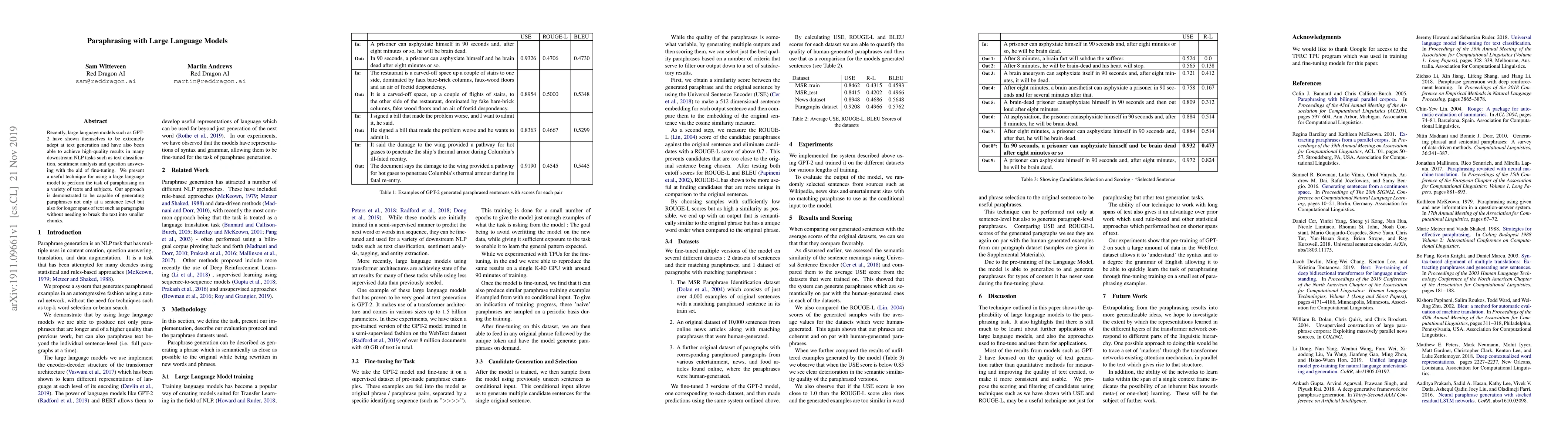 This paper introduces a method for leveraging large language models like GPT-2 to generate high-quality paraphrases at both sentence and paragraph levels, without segmenting the text into smaller parts. The technique demonstrates the model's effectiveness in various paraphrasing tasks.