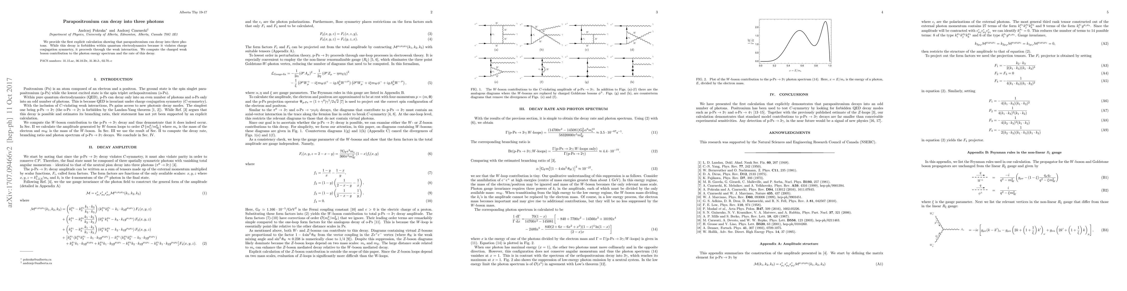Summary: This study calculates the decay rate and spectrum for parapositronium into three photons, a process violating charge conjugation symmetry and allowed by the weak interaction, with a branching ratio fifty orders of magnitude smaller than previously estimated.