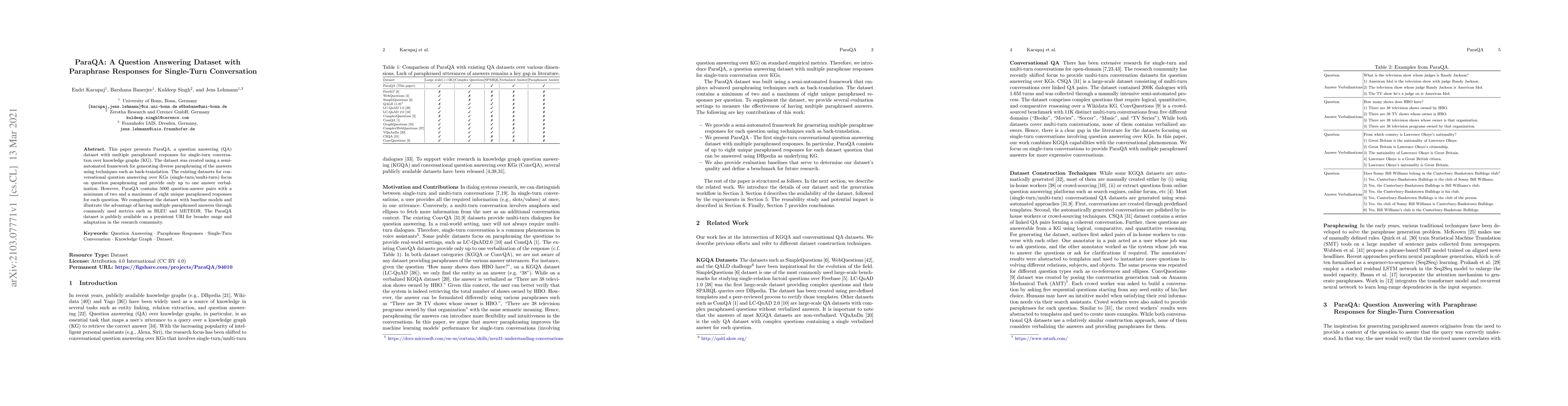 ParaQA is a novel QA dataset featuring multiple paraphrased responses for single-turn conversation over knowledge graphs, created using a semi-automated framework. The dataset provides 5000 question-answer pairs with 2-8 unique paraphrased answers per question, and baseline models demonstrate the benefits of multiple responses using metrics like BLEU and METEOR.
