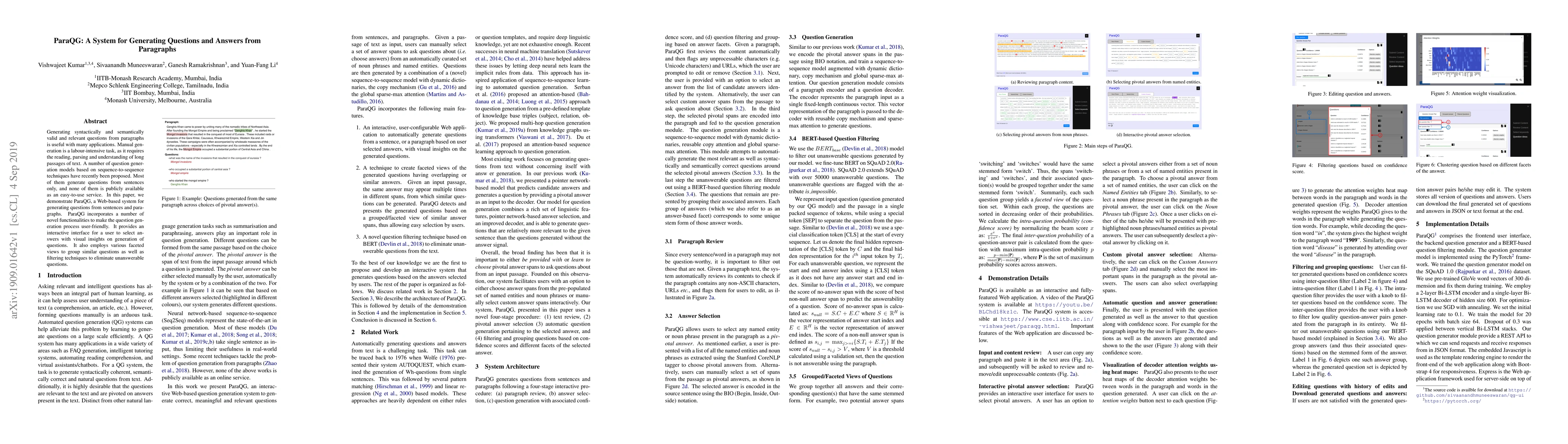ParaQG is a web-based system designed to generate questions from paragraphs, offering interactive features and visual insights to enhance usability. It employs sequence-to-sequence techniques and provides filtering to ensure relevance and answerability of generated questions.