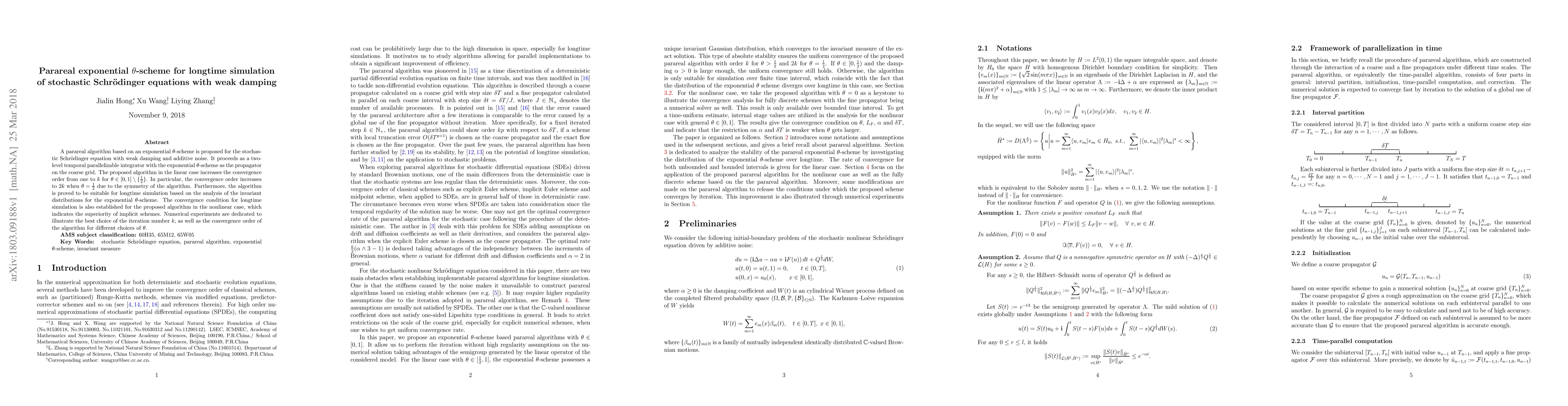 A parareal algorithm based on an exponential $\theta$-scheme is proposed for the stochastic Schr\"odinger equation with weak damping and additive noise. It proceeds as a two-level temporal parallelizable integrator with the exponential $\theta$-scheme as the propagator on the coarse grid. The proposed algorithm in the linear case increases the convergence order from one to $k$ for $\theta\in[0,1]\setminus\{\frac12\}$. In particular, the convergence order increases to $2k$ when $\theta=\frac12$ due to the symmetry of the algorithm. Furthermore, the algorithm is proved to be suitable for longtime simulation based on the analysis of the invariant distributions for the exponential $\theta$-scheme. The convergence condition for longtime simulation is also established for the proposed algorithm in the nonlinear case, which indicates the superiority of implicit schemes. Numerical experiments are dedicated to illustrate the best choice of the iteration number $k$, as well as the convergence order of the algorithm for different choices of $\theta$.