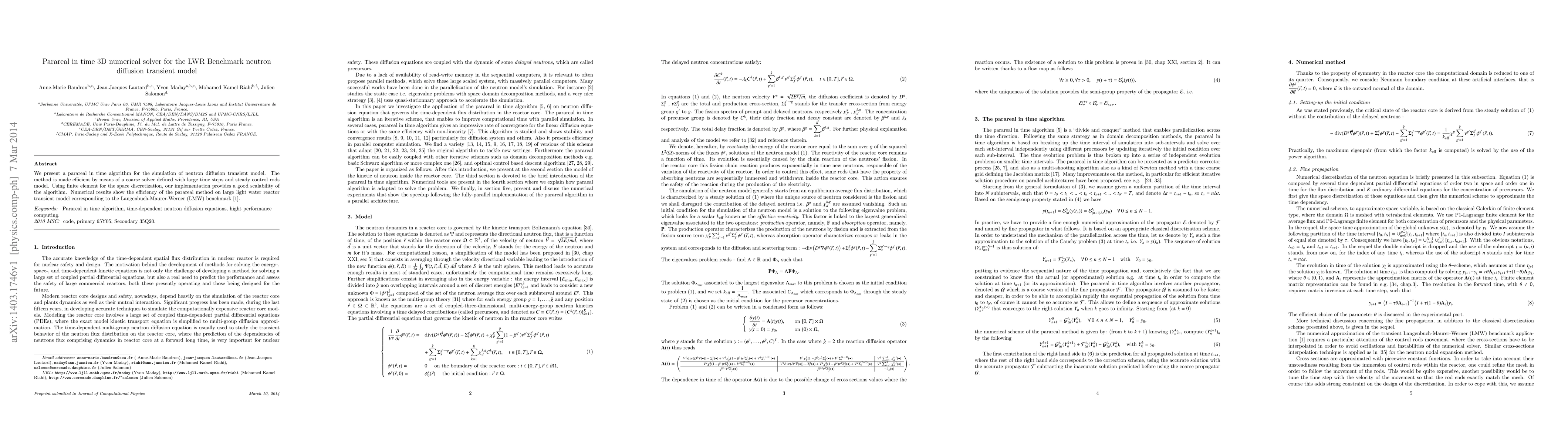 We present a parareal in time algorithm for the simulation of neutron diffusion transient model. The method is made efficient by means of a coarse solver defined with large time steps and steady control rods model. Using finite element for the space discretization, our implementation provides a good scalability of the algorithm. Numerical results show the efficiency of the parareal method on large light water reactor transient model corresponding to the Langenbuch-Maurer-Werner (LMW) benchmark [1].