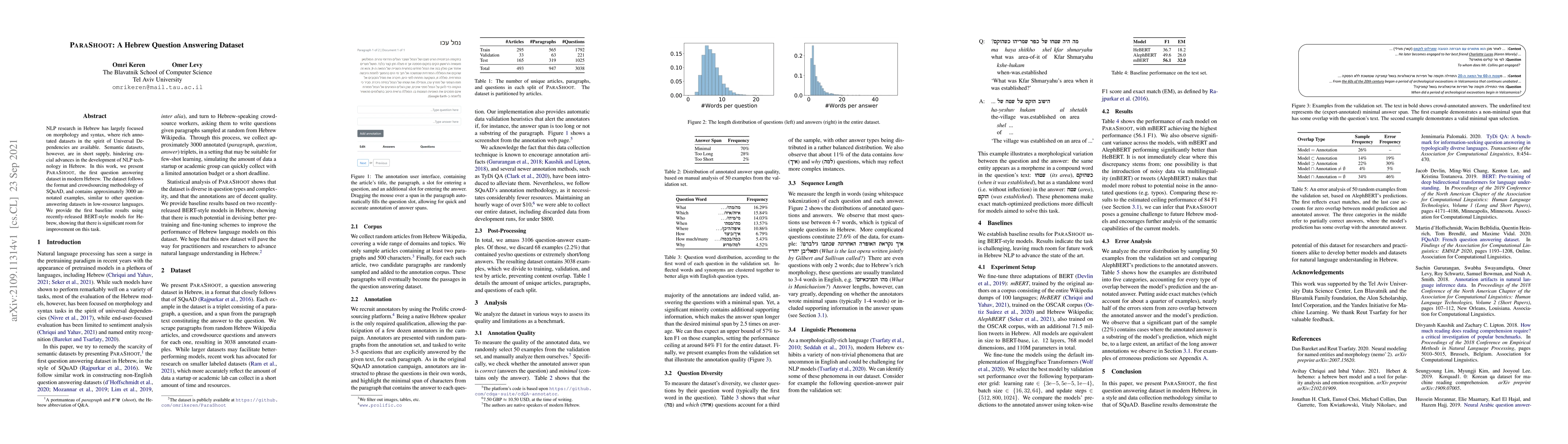ParaShoot is the first Hebrew question-answering dataset, aiming to advance NLP technology in Hebrew by addressing the scarcity of semantic datasets. Initial baseline results using BERT-style models indicate substantial room for improvement.