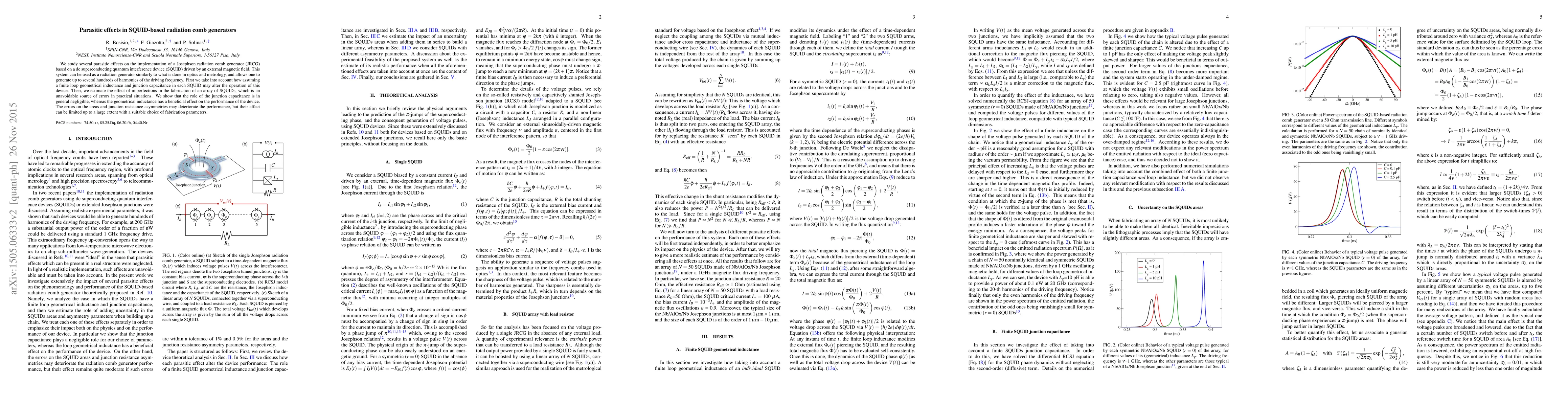 The paper presents a comprehensive analysis of parasitic effects on SQUID-based radiation comb generators, providing insights into how geometrical inductance, junction capacitance, and fabrication imperfections impact device performance.