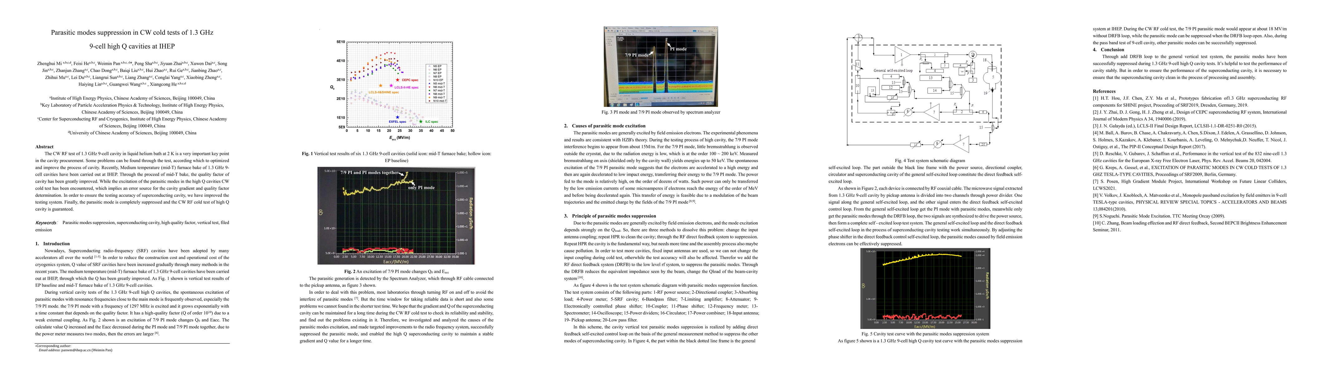 The paper discusses the suppression of parasitic modes in continuous wave (CW) cold tests of 1.3 GHz 9-cell high Q superconducting cavities at IHEP, highlighting the successful optimization of the testing system to ensure accurate measurement of cavity gradient and quality factor.