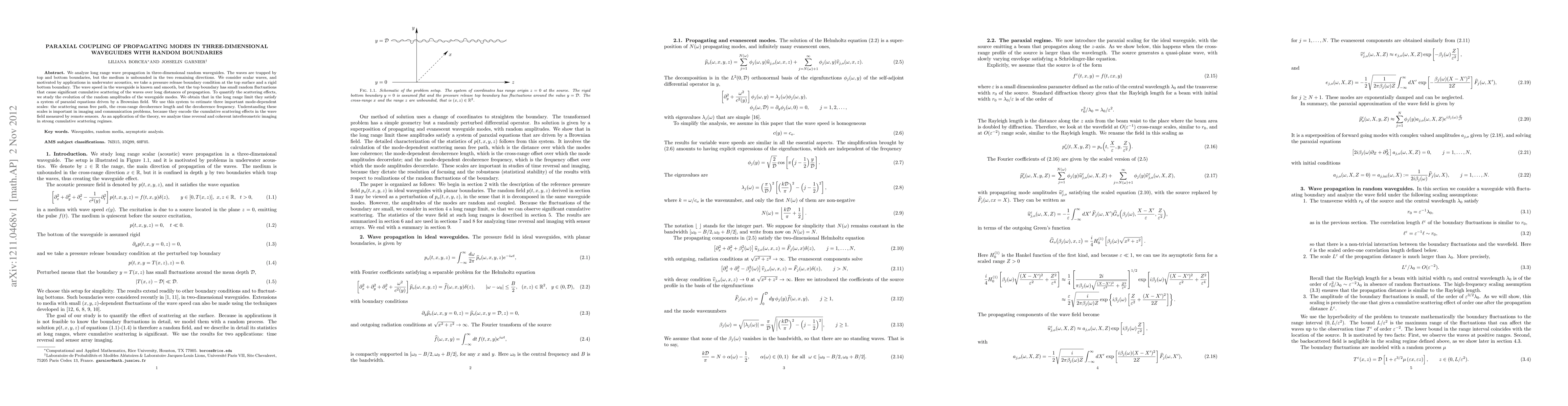 We analyze long range wave propagation in three-dimensional random waveguides. The waves are trapped by top and bottom boundaries, but the medium is unbounded in the two remaining directions. We consider scalar waves, and motivated by applications in underwater acoustics, we take a pressure release boundary condition at the top surface and a rigid bottom boundary. The wave speed in the waveguide is known and smooth, but the top boundary has small random fluctuations that cause significant cumulative scattering of the waves over long distances of propagation. To quantify the scattering effects, we study the evolution of the random amplitudes of the waveguide modes. We obtain that in the long range limit they satisfy a system of paraxial equations driven by a Brownian field. We use this system to estimate three important mode-dependent scales: the scattering mean free path, the cross-range decoherence length and the decoherence frequency. Understanding these scales is important in imaging and communication problems, because they encode the cumulative scattering effects in the wave field measured by remote sensors. As an application of the theory, we analyze time reversal and coherent interferometric imaging in strong cumulative scattering regimes.