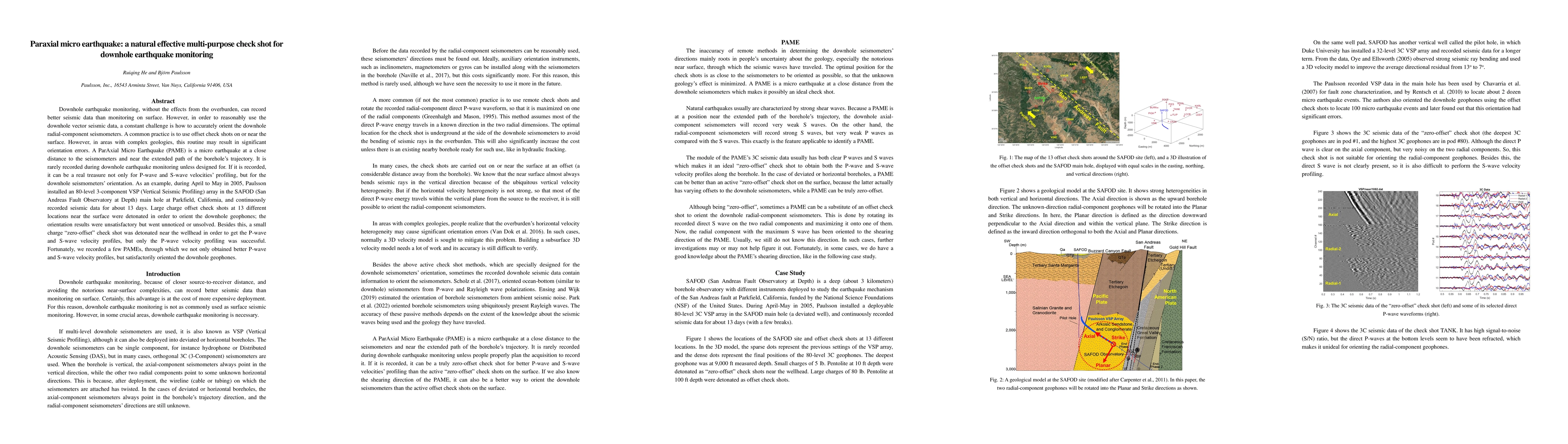 This research proposes the use of a Paraxial Micro Earthquake (PAME) as an effective check shot for accurately orienting downhole seismometers in earthquake monitoring, overcoming the limitations of traditional offset check shots in complex geological areas. Recorded PAMEs during a 2005 study at SAFOD provided better seismic data and improved orientation of the downhole geophones.