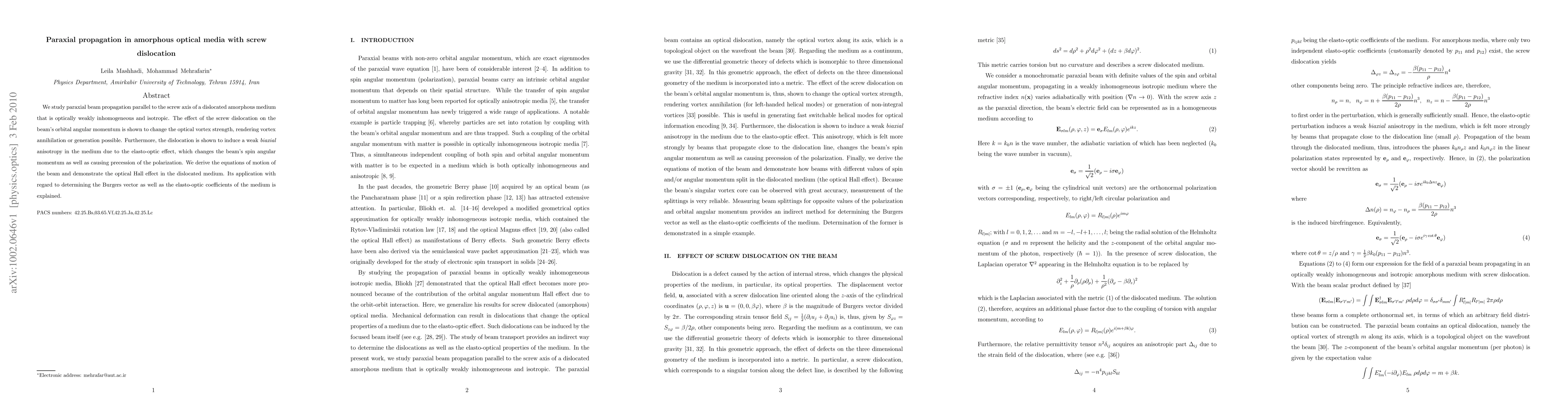 This paper investigates paraxial beam propagation in amorphous optical media with screw dislocations, demonstrating how the dislocation alters the beam's orbital angular momentum and induces biaxial anisotropy, leading to vortex annihilation or generation, changes in spin angular momentum, and the optical Hall effect. The study also explores the method's application for determining the Burgers vector and elasto-optic coefficients.