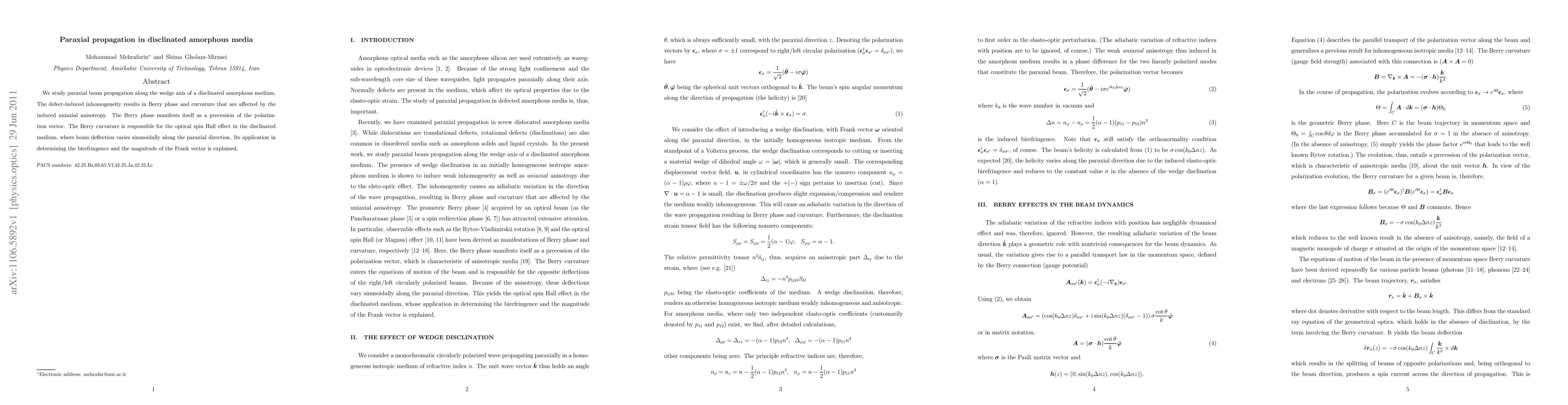 This paper investigates how paraxial beams propagate through disclinated amorphous media, revealing that the induced uniaxial anisotropy leads to a Berry phase causing polarization precession and a Berry curvature responsible for the optical spin Hall effect, which sinusoidally deflects beams and aids in determining birefringence and Frank vector magnitude.