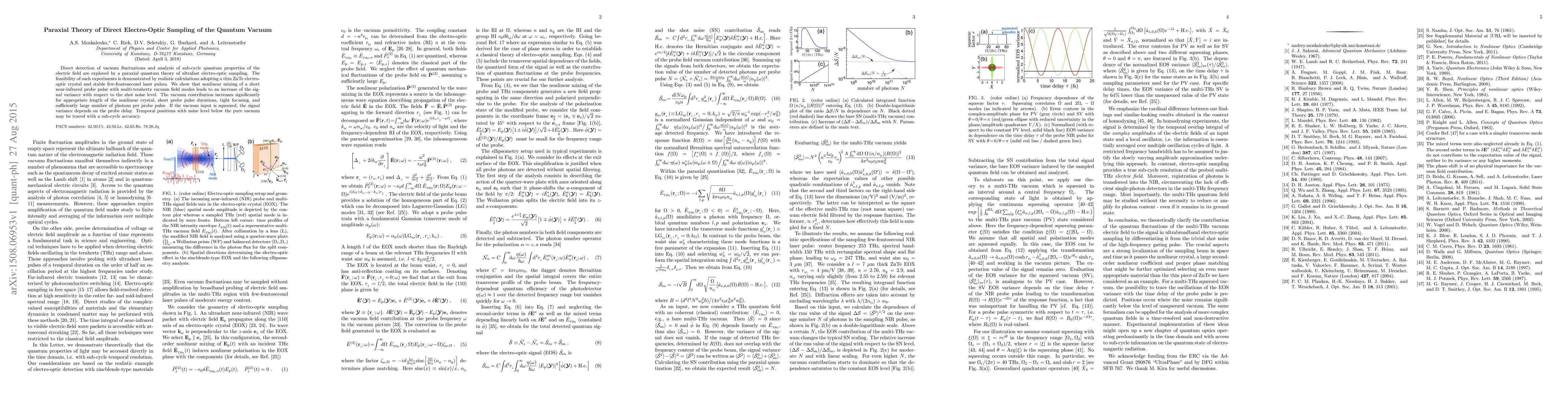 This paper explores a paraxial quantum theory for detecting vacuum fluctuations via ultrafast electro-optic sampling, demonstrating the feasibility using ZnTe crystals and femtosecond laser pulses. The study shows that nonlinear interactions can enhance signal variance above shot noise, particularly under specific conditions like tight focusing and squeezed vacuum input, allowing sub-cycle noise reduction.