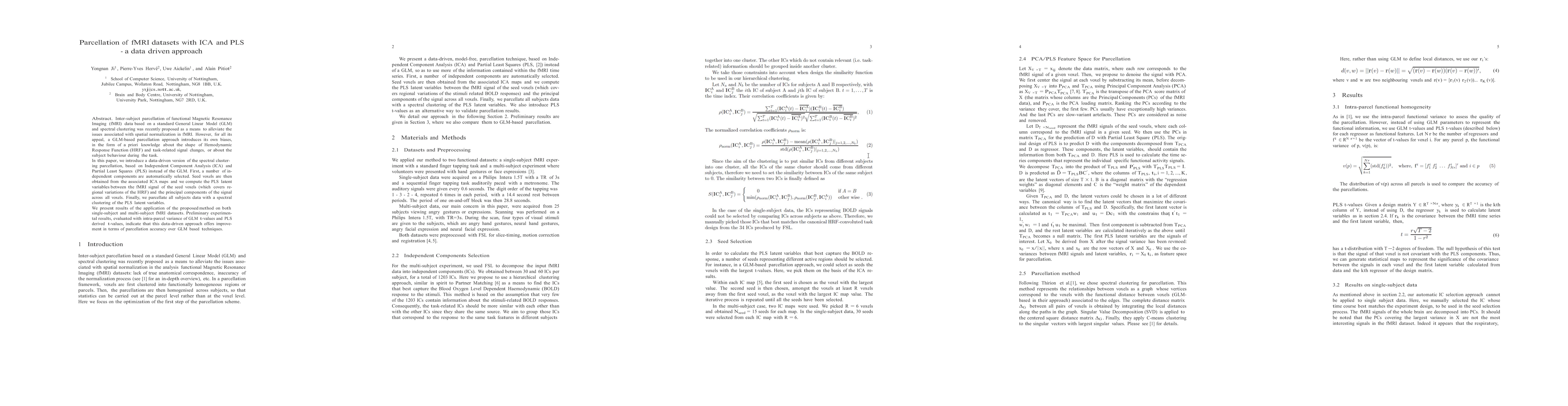 This paper proposes a data-driven parcellation method for fMRI datasets using ICA and PLS instead of GLM, aiming to reduce biases from a priori knowledge. The method involves selecting independent components, deriving seed voxels from ICA, and computing PLS latent variables for spectral clustering, showing improved parcellation accuracy over GLM-based techniques.