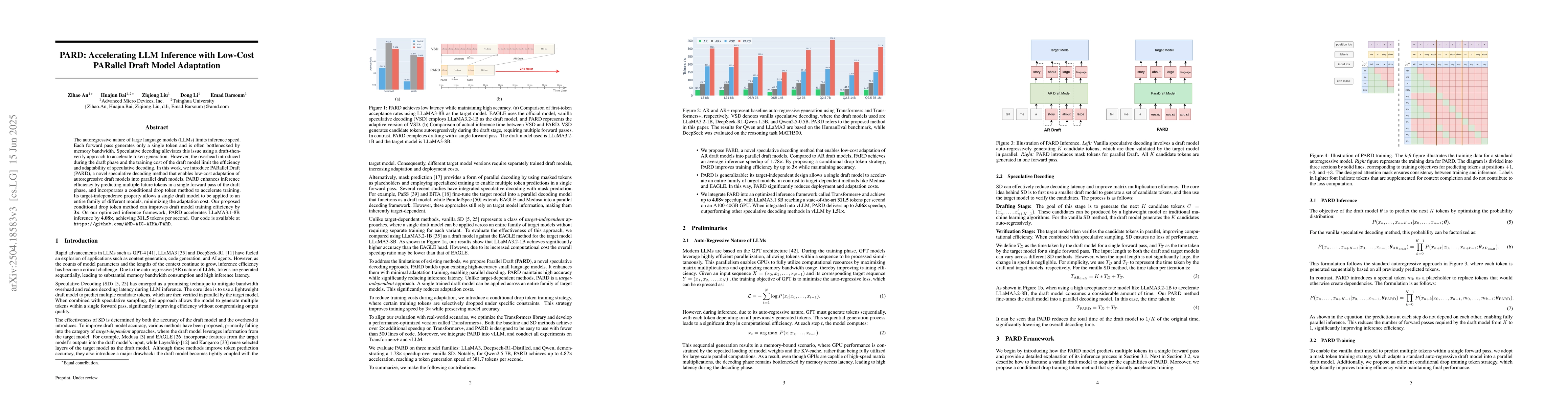 The paper introduces PARD, a novel speculative decoding method that adapts low-cost parallel draft models for accelerating large language model (LLM) inference. PARD predicts multiple future tokens in a single forward pass, incorporates a conditional drop token method for efficient training, and maintains target-independence for wide applicability.
