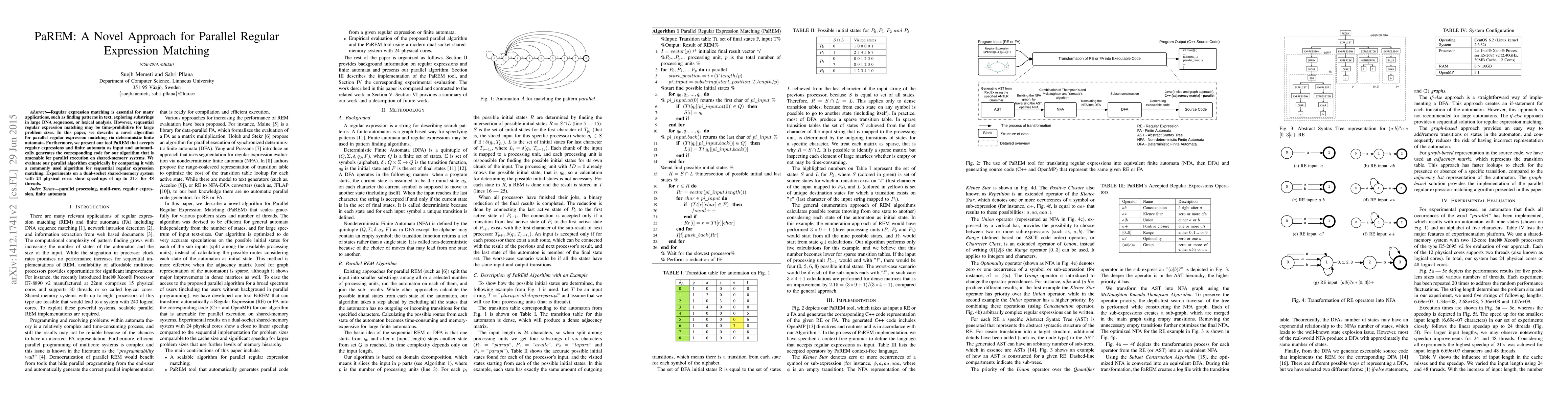 This paper introduces PaREM, a novel parallel algorithm for regular expression matching using deterministic finite automata, and a tool that automatically generates parallel code for shared-memory systems. Experimental results demonstrate significant speed-ups, up to 21x, using 48 threads on a dual-socket system.