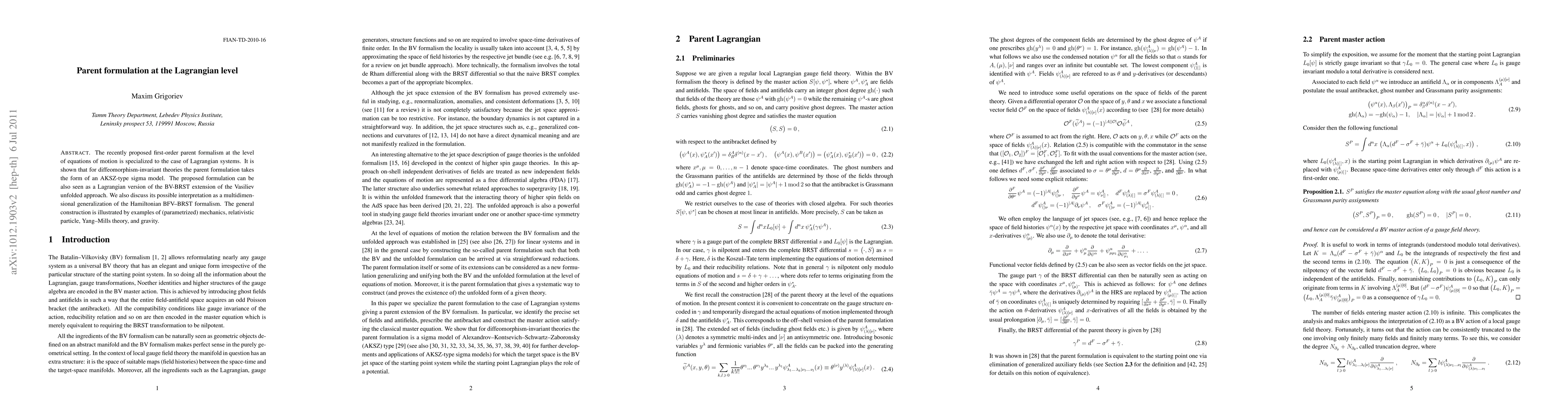 This paper specializes the first-order parent formalism to Lagrangian systems, showing that it manifests as an AKSZ-type sigma model for diffeomorphism-invariant theories. It also interprets the formalism as a Lagrangian version of the BV-BRST extension of the Vasiliev unfolded approach and a multidimensional generalization of the Hamiltonian BFV-BRST formalism.