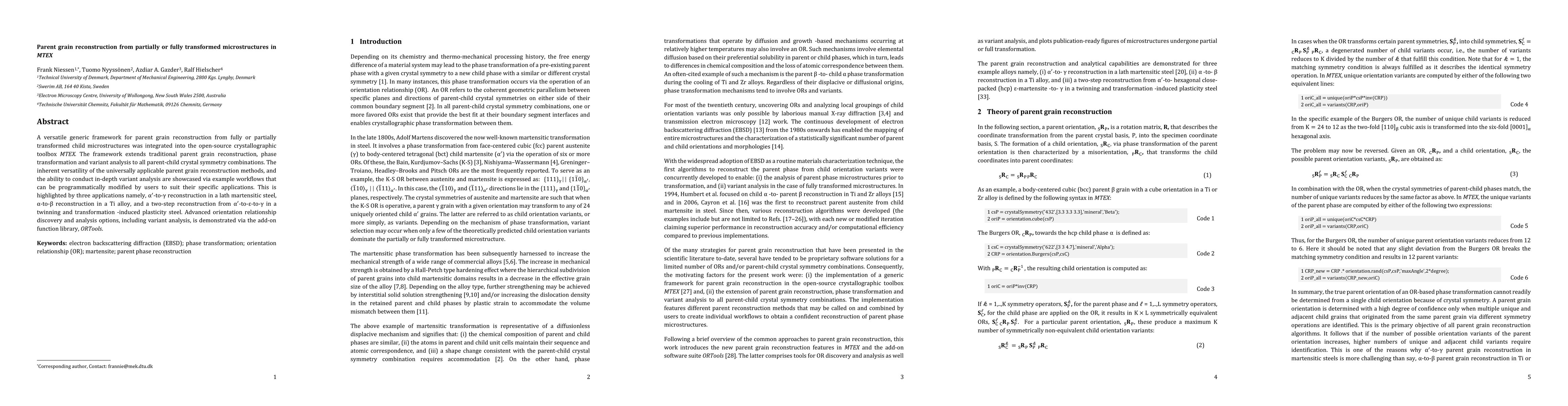 This paper presents a new framework in MTEX for reconstructing parent grains from transformed microstructures, applicable to various crystal symmetry combinations. It demonstrates the method's versatility through applications in martensitic steel, Ti alloy, and a complex twinning-induced steel, showcasing advanced orientation relationship analysis.