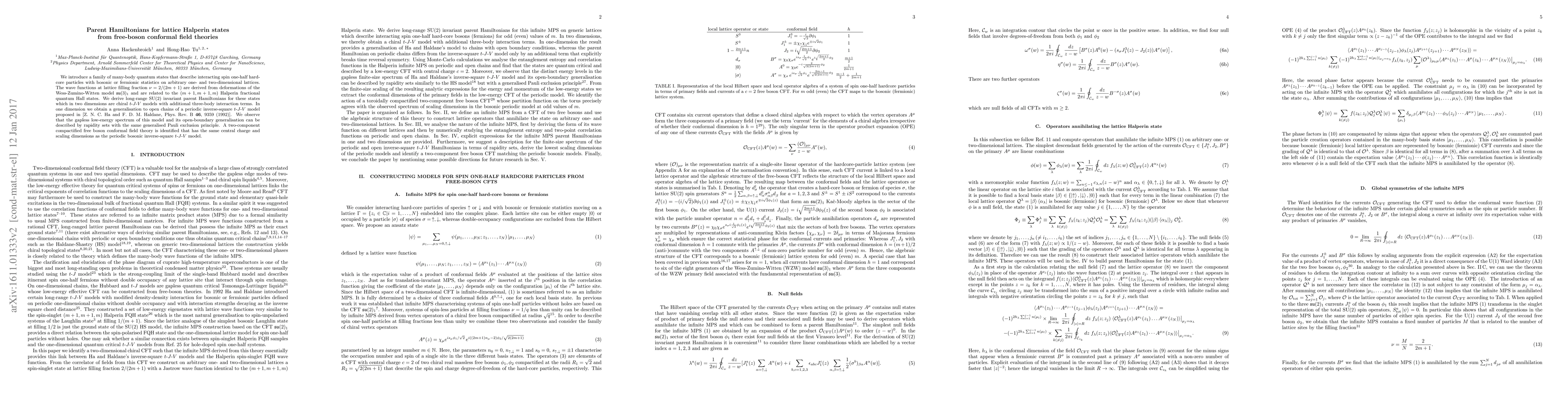 We introduce a family of many-body quantum states that describe interacting spin one-half hard-core particles with bosonic or fermionic statistics on arbitrary one- and two-dimensional lattices. The wave functions at lattice filling fraction $\nu=2/(2m+1)$ are derived from deformations of the Wess-Zumino-Witten model $\mathfrak{su}(3)_1$ and are related to the $(m+1,m+1,m)$ Halperin fractional quantum Hall states. We derive long-range SU(2) invariant parent Hamiltonians for these states which in two dimensions are chiral $t$-$J$-$V$ models with additional three-body interaction terms. In one dimension we obtain a generalisation to open chains of a periodic inverse-square $t$-$J$-$V$ model proposed in [Z. N. C. Ha and F. D. M. Haldane, Phys. Rev. B $\mathbf{46}$, 9359 (1992)]. We observe that the gapless low-energy spectrum of this model and its open-boundary generalisation can be described by rapidity sets with the same generalised Pauli exclusion principle. A two-component compactified free boson conformal field theory is identified that has the same central charge and scaling dimensions as the periodic bosonic inverse-square $t$-$J$-$V$ model.