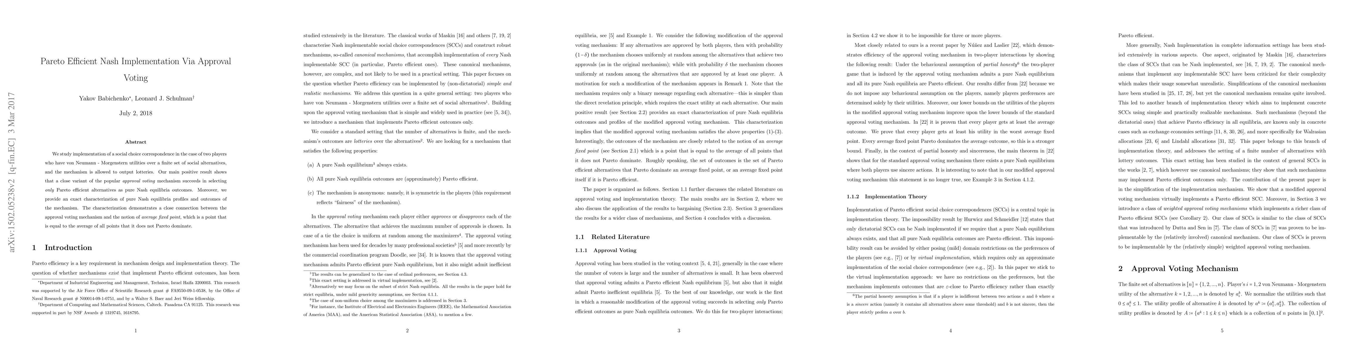 We study implementation of a social choice correspondence in the case of two players who have von Neumann - Morgenstern utilities over a finite set of social alternatives, and the mechanism is allowed to output lotteries. Our main positive result shows that a close variant of the popular approval voting mechanism succeeds in selecting only Pareto efficient alternatives as pure Nash equilibria outcomes. Moreover, we provide an exact characterization of pure Nash equilibria profiles and outcomes of the mechanism. The characterization demonstrates a close connection between the approval voting mechanism and the notion of average fixed point, which is a point that is equal to the average of all points that it does not Pareto dominate.