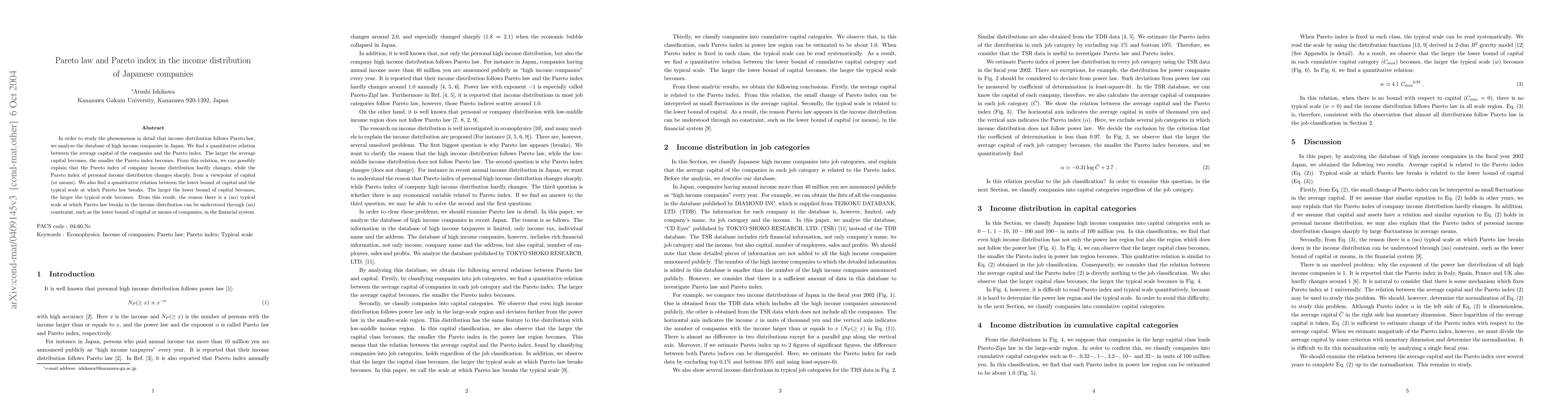 The study finds a quantitative relation between average company capital and Pareto index, suggesting that a lower capital threshold may influence the presence of a typical scale in income distribution.