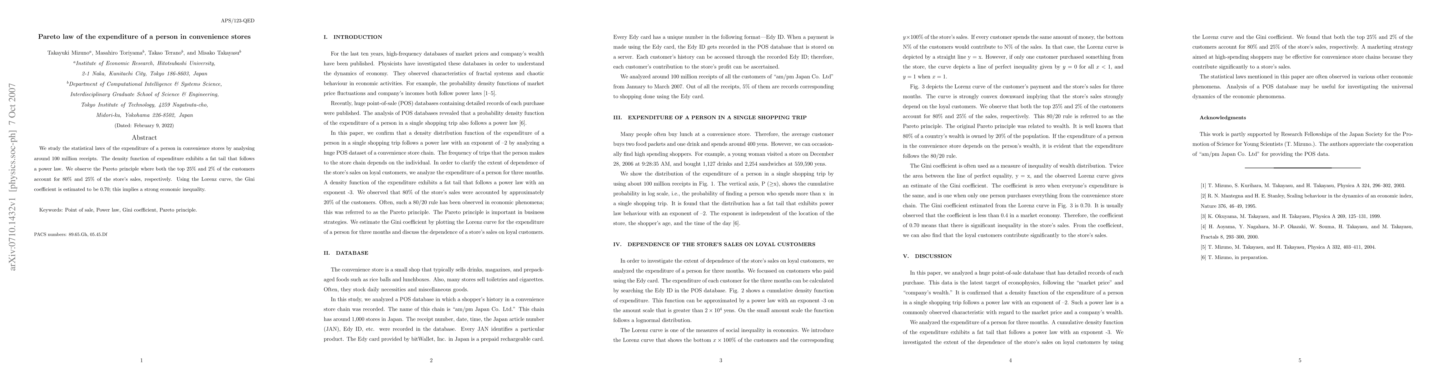 This study analyzes 100 million receipts to reveal a Pareto distribution in convenience store expenditures, with the top 25% of customers accounting for 80% of sales and the top 2% for 25%. The Gini coefficient of 0.70 indicates significant economic inequality.