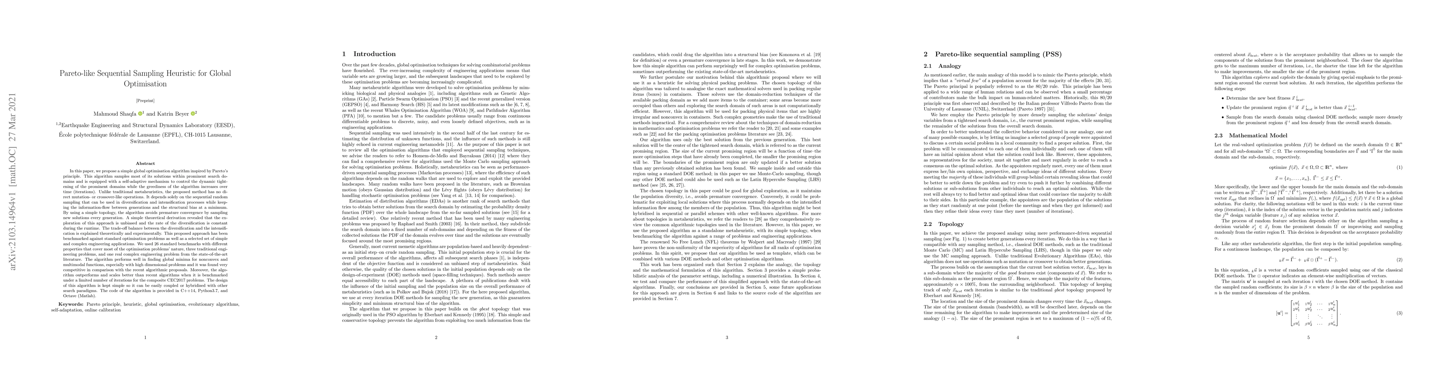 In this paper, we propose a simple global optimisation algorithm inspired by Pareto's principle. This algorithm samples most of its solutions within prominent search domains and is equipped with a self-adaptive mechanism to control the dynamic tightening of the prominent domains while the greediness of the algorithm increases over time (iterations). Unlike traditional metaheuristics, the proposed method has no direct mutation- or crossover-like operations. It depends solely on the sequential random sampling that can be used in diversification and intensification processes while keeping the information-flow between generations and the structural bias at a minimum. By using a simple topology, the algorithm avoids premature convergence by sampling new solutions every generation. A simple theoretical derivation revealed that the exploration of this approach is unbiased and the rate of the diversification is constant during the runtime. The trade-off balance between the diversification and the intensification is explained theoretically and experimentally. This proposed approach has been benchmarked against standard optimisation problems as well as a selected set of simple and complex engineering applications. We used 26 standard benchmarks with different properties that cover most of the optimisation problems' nature, three traditional engineering problems, and one real complex engineering problem from the state-of-the-art literature. The algorithm performs well in finding global minima for nonconvex and multimodal functions, especially with high dimensional problems and it was found very competitive in comparison with the recent algorithmic proposals. Moreover, the algorithm outperforms and scales better than recent algorithms when it is benchmarked under a limited number of iterations for the composite CEC2017 problems.