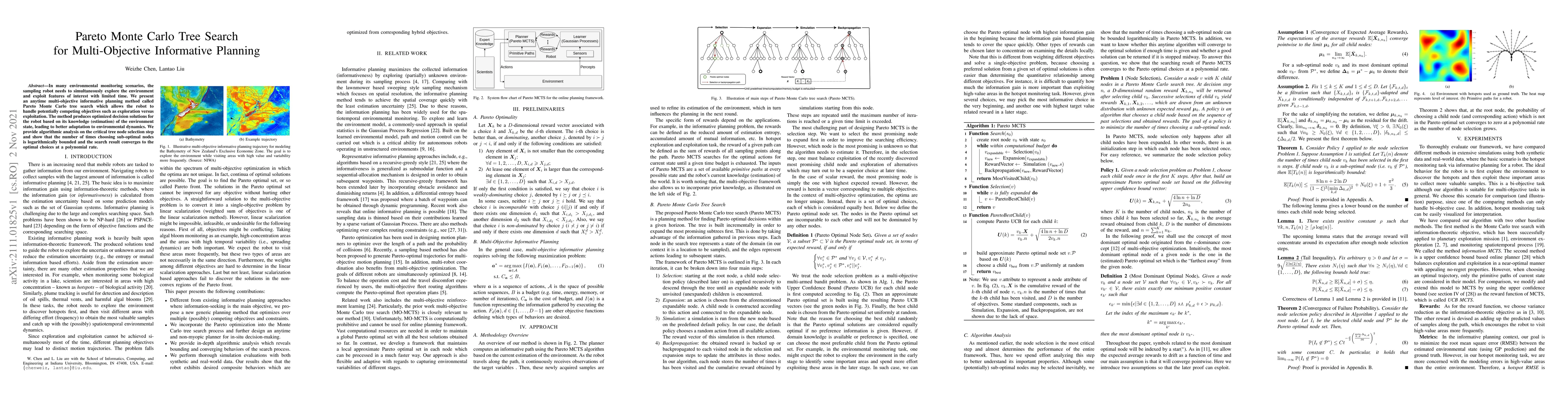 This paper introduces Pareto Monte Carlo tree search for multi-objective planning in environmental monitoring, enabling robots to balance exploration and exploitation under time constraints. The method optimizes decision-making based on environmental state estimation, with algorithmic analysis proving logarithmic bounds on suboptimal node selections and polynomial convergence to optimal choices.