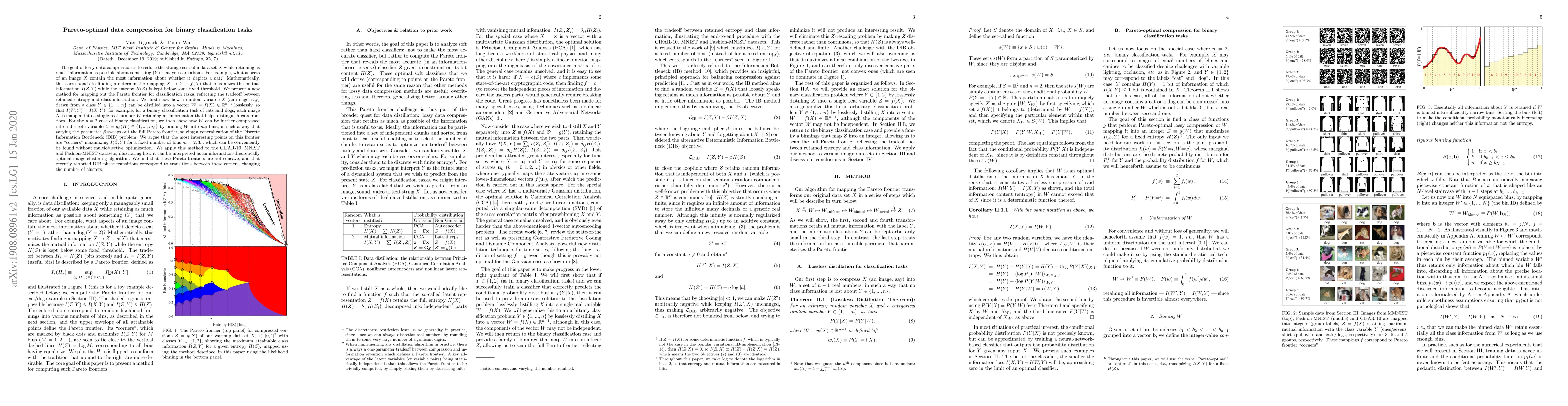The goal of lossy data compression is to reduce the storage cost of a data set $X$ while retaining as much information as possible about something ($Y$) that you care about. For example, what aspects of an image $X$ contain the most information about whether it depicts a cat? Mathematically, this corresponds to finding a mapping $X\to Z\equiv f(X)$ that maximizes the mutual information $I(Z,Y)$ while the entropy $H(Z)$ is kept below some fixed threshold. We present a method for mapping out the Pareto frontier for classification tasks, reflecting the tradeoff between retained entropy and class information. We first show how a random variable $X$ (an image, say) drawn from a class $Y\in\{1,...,n\}$ can be distilled into a vector $W=f(X)\in \mathbb{R}^{n-1}$ losslessly, so that $I(W,Y)=I(X,Y)$; for example, for a binary classification task of cats and dogs, each image $X$ is mapped into a single real number $W$ retaining all information that helps distinguish cats from dogs. For the $n=2$ case of binary classification, we then show how $W$ can be further compressed into a discrete variable $Z=g_\beta(W)\in\{1,...,m_\beta\}$ by binning $W$ into $m_\beta$ bins, in such a way that varying the parameter $\beta$ sweeps out the full Pareto frontier, solving a generalization of the Discrete Information Bottleneck (DIB) problem. We argue that the most interesting points on this frontier are "corners" maximizing $I(Z,Y)$ for a fixed number of bins $m=2,3...$ which can be conveniently be found without multiobjective optimization. We apply this method to the CIFAR-10, MNIST and Fashion-MNIST datasets, illustrating how it can be interpreted as an information-theoretically optimal image clustering algorithm.