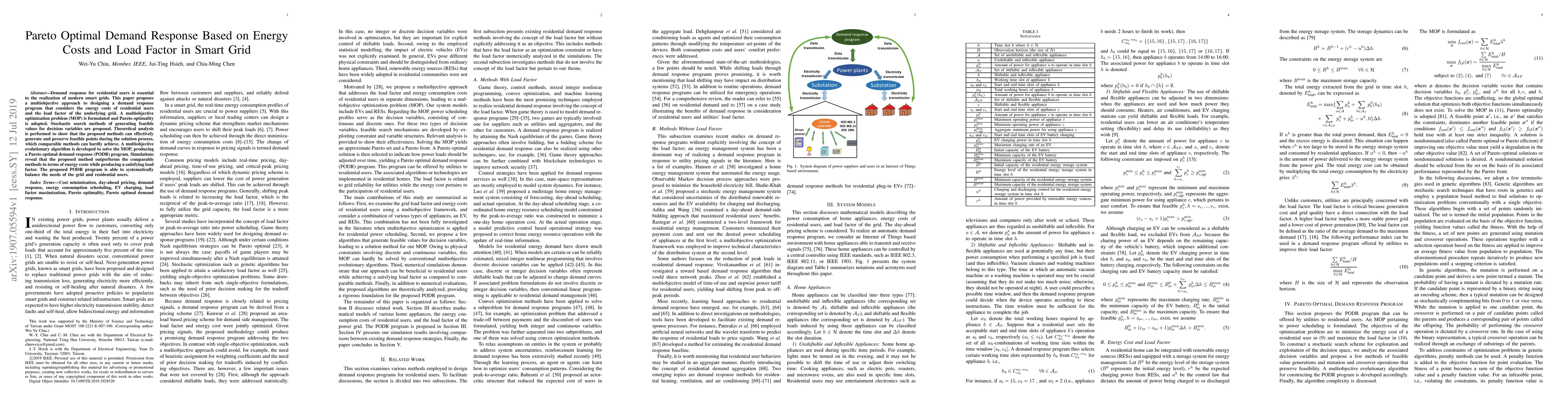 Demand response for residential users is essential to the realization of modern smart grids. This paper proposes a multiobjective approach to designing a demand response program that considers the energy costs of residential users and the load factor of the underlying grid. A multiobjective optimization problem (MOP) is formulated and Pareto optimality is adopted. Stochastic search methods of generating feasible values for decision variables are proposed. Theoretical analysis is performed to show that the proposed methods can effectively generate and preserve feasible points during the solution process, which comparable methods can hardly achieve. A multiobjective evolutionary algorithm is developed to solve the MOP, producing a Pareto optimal demand response (PODR) program. Simulations reveal that the proposed method outperforms the comparable methods in terms of energy costs while producing a satisfying load factor. The proposed PODR program is able to systematically balance the needs of the grid and residential users.