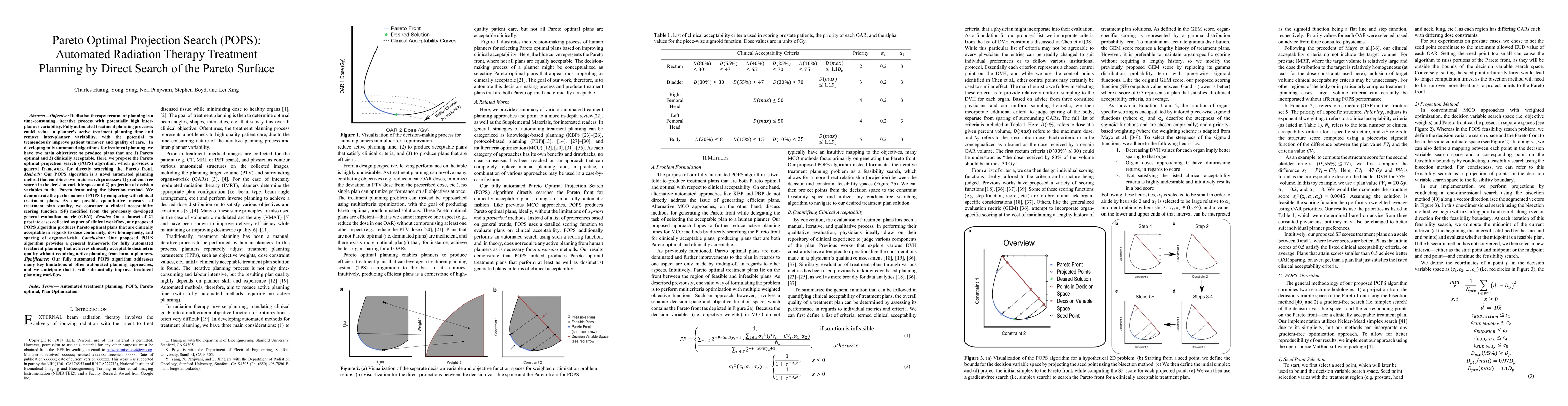 The Pareto optimal projection search (POPS) algorithm is a novel automated method for radiation therapy treatment planning that directly searches the Pareto front to produce Pareto optimal plans. The POPS algorithm combines gradient-free search and bisection method projection, resulting in clinically acceptable plans for prostate cancer cases, thereby reducing inter-planner variability and improving workflow efficiency.