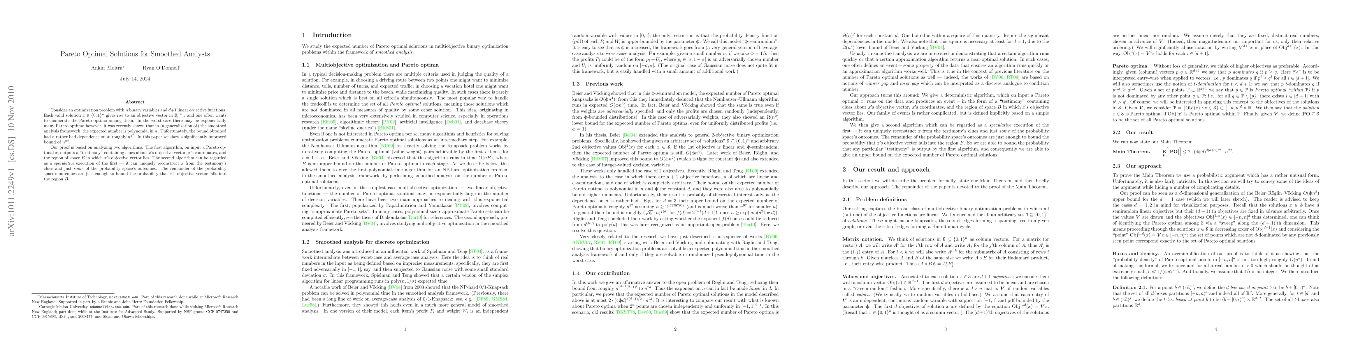Consider an optimization problem with $n$ binary variables and $d+1$ linear objective functions. Each valid solution $x \in \{0,1\}^n$ gives rise to an objective vector in $\R^{d+1}$, and one often wants to enumerate the Pareto optima among them. In the worst case there may be exponentially many Pareto optima; however, it was recently shown that in (a generalization of) the smoothed analysis framework, the expected number is polynomial in $n$. Unfortunately, the bound obtained had a rather bad dependence on $d$; roughly $n^{d^d}$. In this paper we show a significantly improved bound of $n^{2d}$. Our proof is based on analyzing two algorithms. The first algorithm, on input a Pareto optimal $x$, outputs a "testimony" containing clues about $x$'s objective vector, $x$'s coordinates, and the region of space $B$ in which $x$'s objective vector lies. The second algorithm can be regarded as a {\em speculative} execution of the first -- it can uniquely reconstruct $x$ from the testimony's clues and just \emph{some} of the probability space's outcomes. The remainder of the probability space's outcomes are just enough to bound the probability that $x$'s objective vector falls into the region $B$.