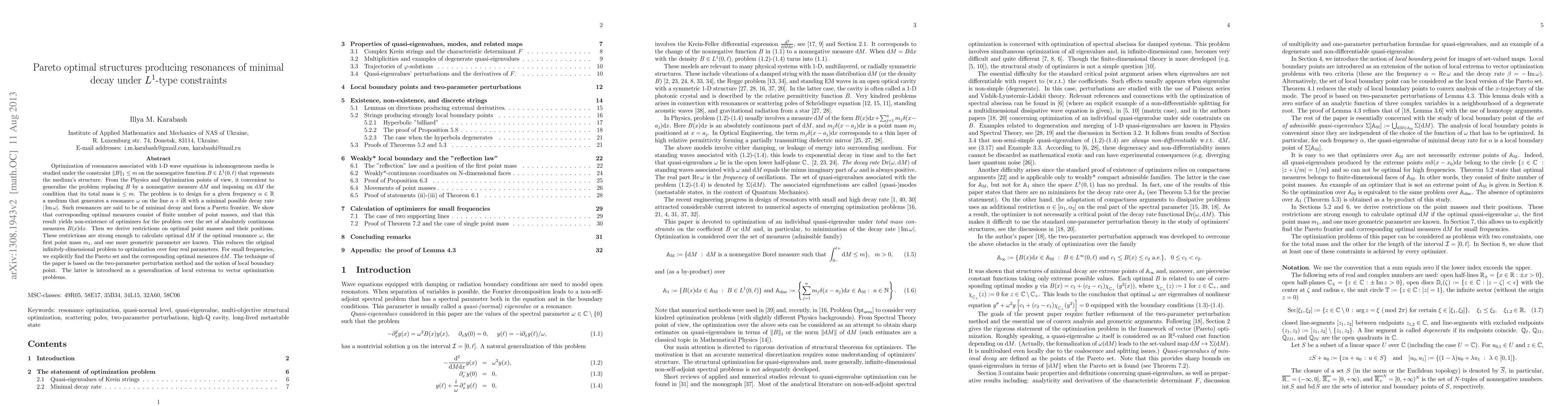 Optimization of resonances associated with 1-D wave equations in inhomogeneous media is studied under the constraint $\| B \|_1 <= m$ on the nonnegative function $B \in L^1 (0,\ell)$ that represents the medium's structure. From the Physics and Optimization points of view, it convenient to generalize the problem replacing $B$ by a nonnegative measure $d M$ and imposing on $d M$ the condition that its total mass is $<= m$. The problem is to design for a given frequency $\alpha \in R$ a medium that generates a resonance $ \omega $ on the line $\alpha + i R$ with a minimal possible decay rate $| Im \omega |$. Such resonances are said to be of minimal decay and form a Pareto frontier. We show that corresponding optimal measures consist of finite number of point masses, and that this result yields non-existence of optimizers for the problem over the set of absolutely continuous measures $B(x) dx$. Then we derive restrictions on optimal point masses and their positions. These restrictions are strong enough to calculate optimal $d M$ if the optimal resonance $ \omega $, the first point mass $m_1$, and one more geometric parameter are known. This reduces the original infinitely-dimensional problem to optimization over four real parameters. For small frequencies, we explicitly find the Pareto set and the corresponding optimal measures $d M$. The technique of the paper is based on the two-parameter perturbation method and the notion of local boundary point. The latter is introduced as a generalization of local extrema to vector optimization problems.