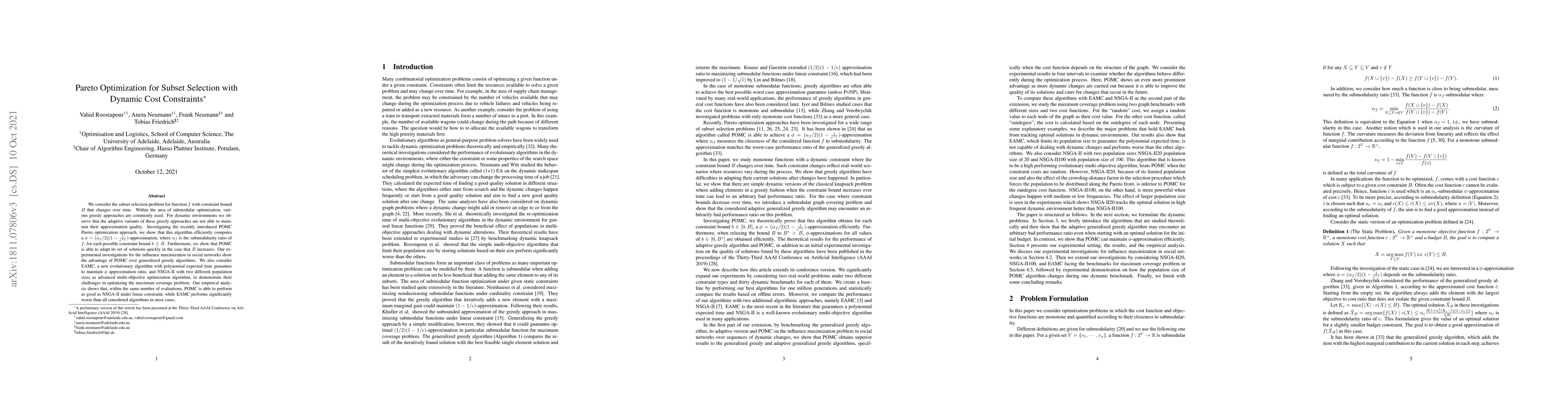 This paper proposes the POMC Pareto optimization approach for subset selection under dynamic cost constraints, demonstrating its efficiency in maintaining approximation quality over time. Experimental results show POMC outperforms generalized greedy algorithms and other multi-objective optimization methods like EAMC and NSGA-II in dynamic environments.