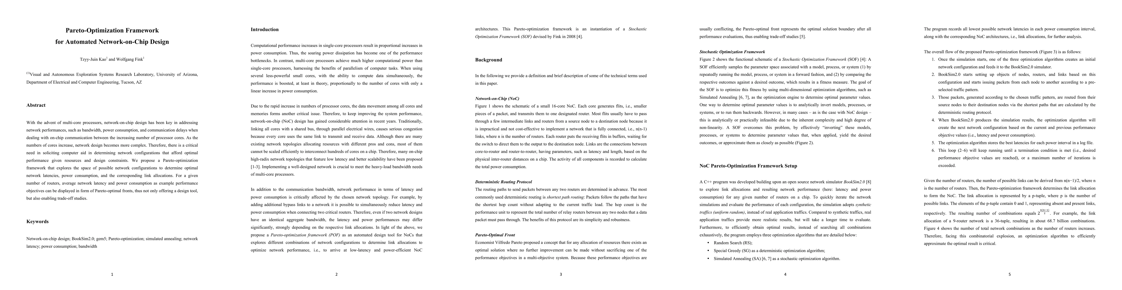 With the advent of multi-core processors, network-on-chip design has been key in addressing network performances, such as bandwidth, power consumption, and communication delays when dealing with on-chip communication between the increasing number of processor cores. As the numbers of cores increase, network design becomes more complex. Therefore, there is a critical need in soliciting computer aid in determining network configurations that afford optimal performance given resources and design constraints. We propose a Pareto-optimization framework that explores the space of possible network configurations to determine optimal network latencies, power consumption, and the corresponding link allocations. For a given number of routers, average network latency and power consumption as example performance objectives can be displayed in form of Pareto-optimal fronts, thus not only offering a design tool, but also enabling trade-off studies.