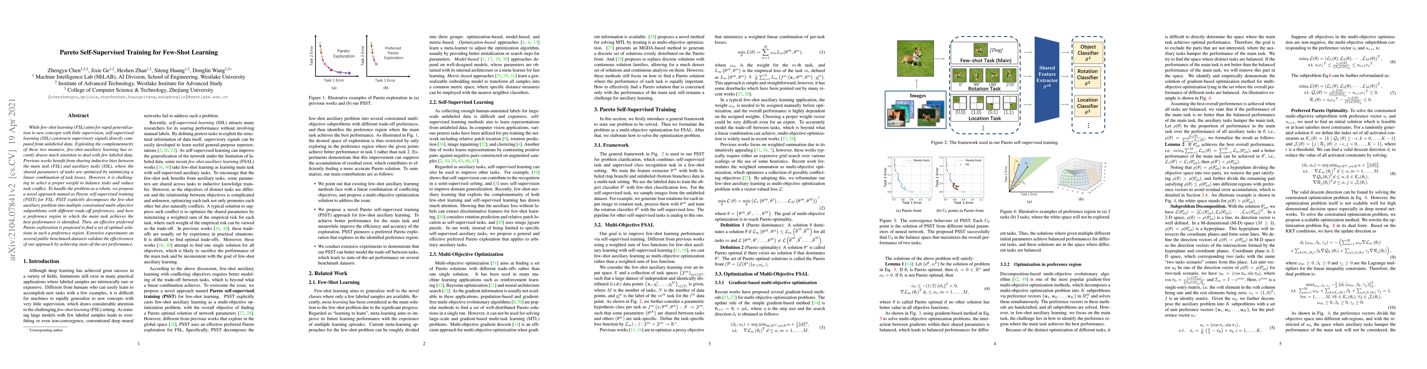 The paper proposes Pareto self-supervised training (PSST) for few-shot learning, which decomposes the auxiliary learning problem into multiple multi-objective subproblems to balance task preferences, achieving state-of-the-art performance on benchmark datasets. PSST identifies a preference region for optimal solutions and employs Pareto exploration to find the best trade-offs.