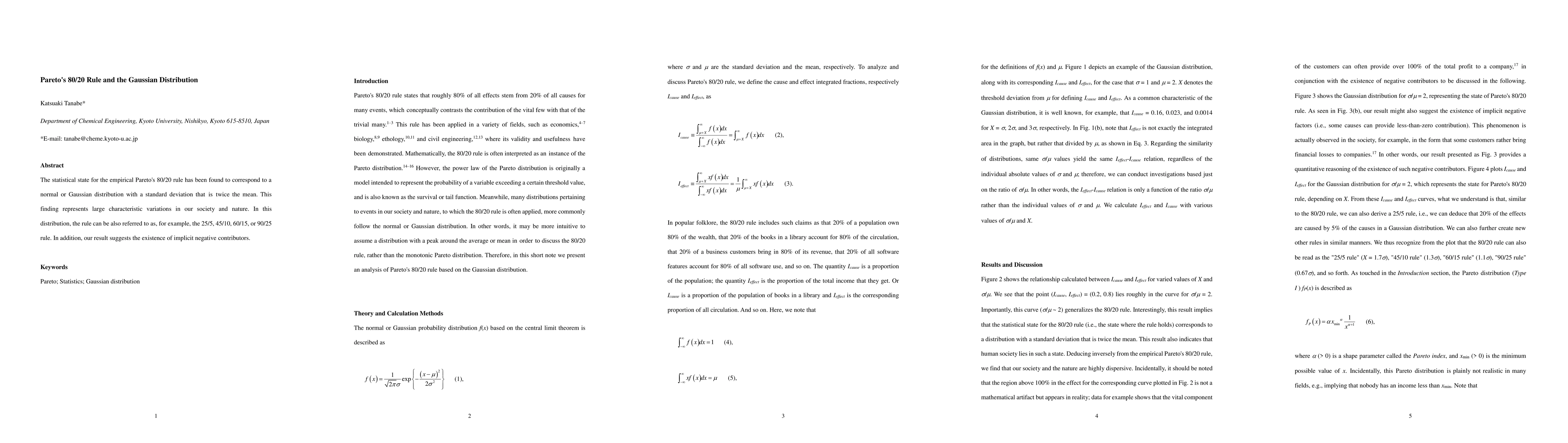 The Pareto's 80/20 rule corresponds to a normal distribution with a standard deviation twice the mean, highlighting large variations in society and nature.