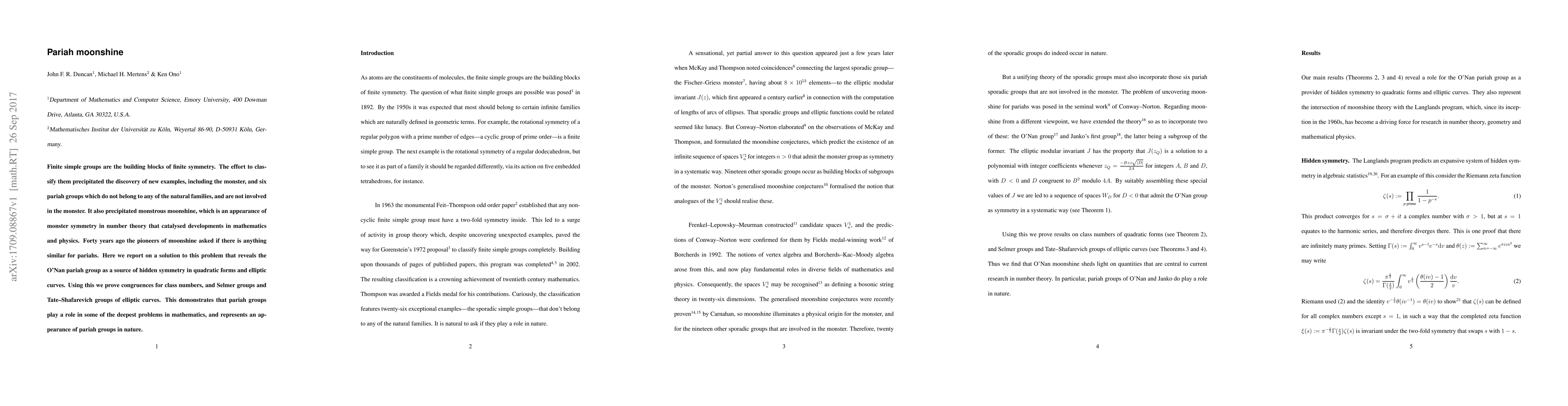 Finite simple groups are the building blocks of finite symmetry. The effort to classify them precipitated the discovery of new examples, including the monster, and six pariah groups which do not belong to any of the natural families, and are not involved in the monster. It also precipitated monstrous moonshine, which is an appearance of monster symmetry in number theory that catalysed developments in mathematics and physics. Forty years ago the pioneers of moonshine asked if there is anything similar for pariahs. Here we report on a solution to this problem that reveals the O'Nan pariah group as a source of hidden symmetry in quadratic forms and elliptic curves. Using this we prove congruences for class numbers, and Selmer groups and Tate--Shafarevich groups of elliptic curves. This demonstrates that pariah groups play a role in some of the deepest problems in mathematics, and represents an appearance of pariah groups in nature.