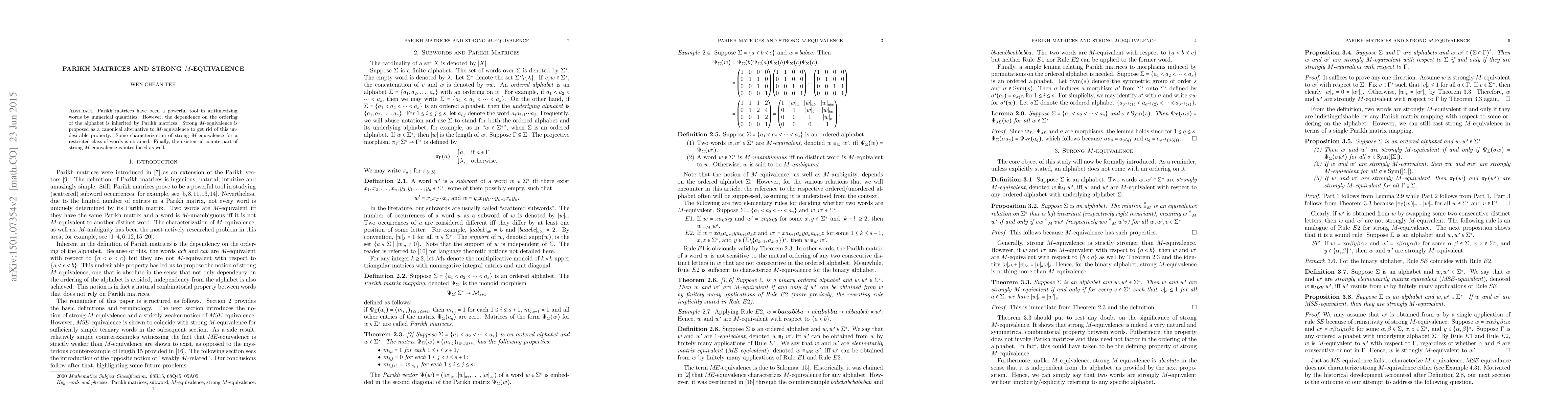 This paper explores the use of Parikh matrices to arithmetize words but critiques their dependence on alphabet ordering. It introduces strong M-equivalence as a canonical alternative to traditional M-equivalence, aiming to eliminate this issue, and provides characterizations for a restricted class of words, along with an existential counterpart.