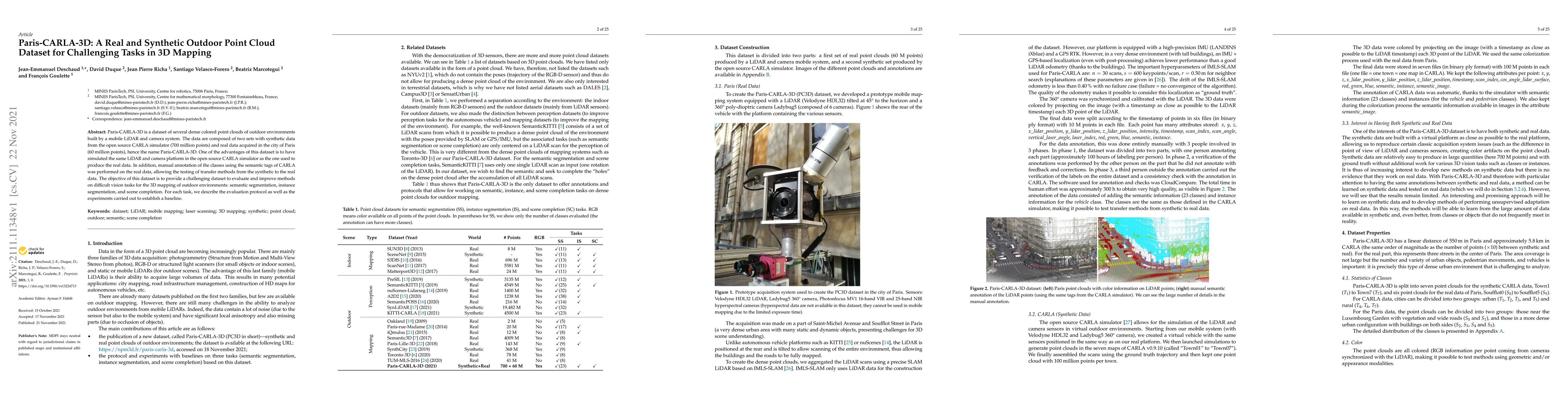 Paris-CARLA-3D is a dataset of several dense colored point clouds of outdoor environments built by a mobile LiDAR and camera system. The data are composed of two sets with synthetic data from the open source CARLA simulator (700 million points) and real data acquired in the city of Paris (60 million points), hence the name Paris-CARLA-3D. One of the advantages of this dataset is to have simulated the same LiDAR and camera platform in the open source CARLA simulator as the one used to produce the real data. In addition, manual annotation of the classes using the semantic tags of CARLA was performed on the real data, allowing the testing of transfer methods from the synthetic to the real data. The objective of this dataset is to provide a challenging dataset to evaluate and improve methods on difficult vision tasks for the 3D mapping of outdoor environments: semantic segmentation, instance segmentation, and scene completion. For each task, we describe the evaluation protocol as well as the experiments carried out to establish a baseline.