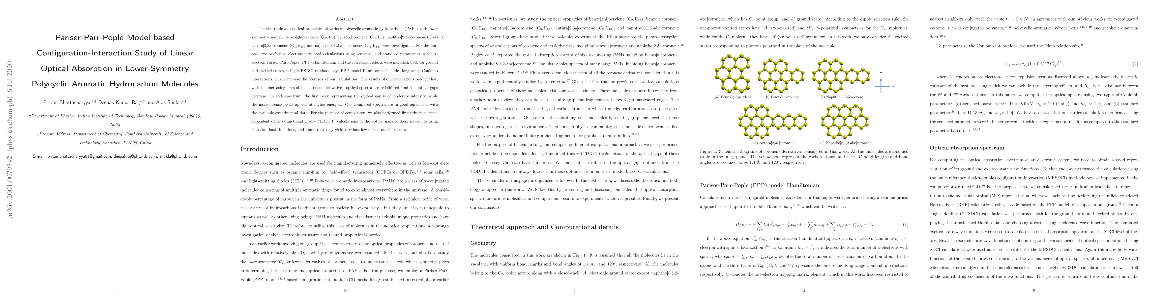 This study investigates the electronic and optical properties of lower-symmetry polycyclic aromatic hydrocarbons using configuration-interaction methods based on the Pariser-Parr-Pople model. The results show red-shifted optical spectra and decreasing optical gaps with increasing molecular size, with computed spectra matching experimental data.