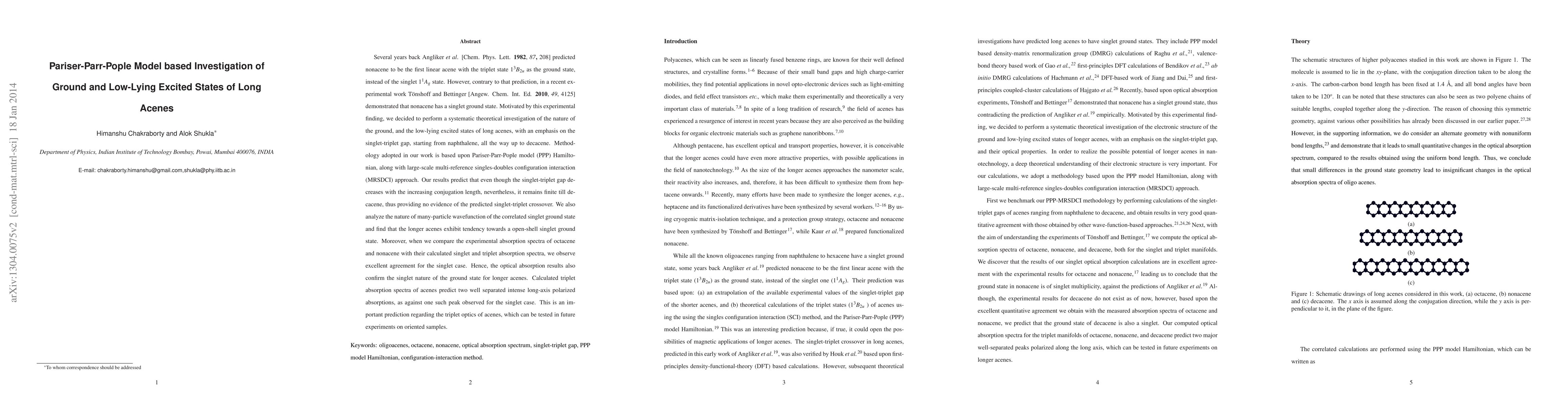 This paper investigates the ground and low-lying excited states of long acenes using the Pariser-Parr-Poppe model and MRSDCI, finding that the singlet-triplet gap decreases but remains finite up to decacene, refuting earlier predictions of a singlet-triplet crossover. The study also confirms the singlet ground state through excellent agreement between calculated and experimental absorption spectra.