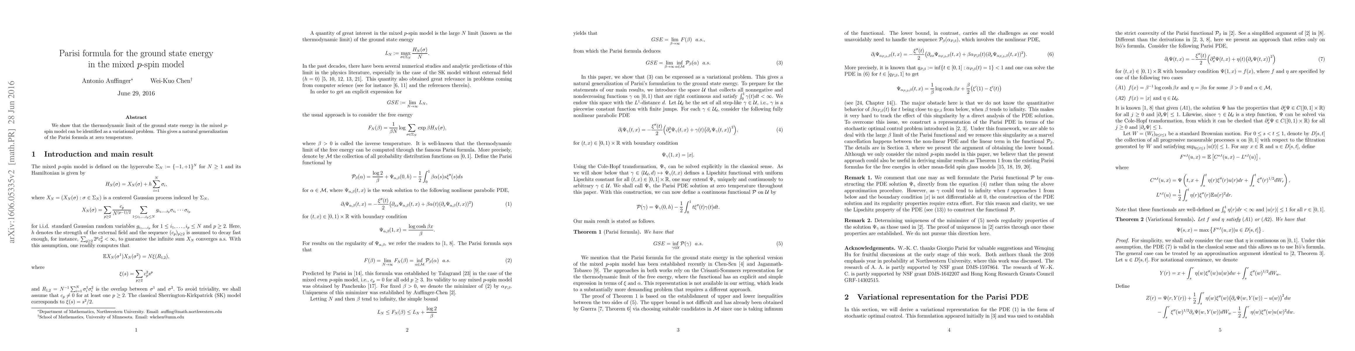 The Parisi formula for the ground state energy in the mixed p-spin model is identified as a variational problem, providing a generalization of the Parisi formula at zero temperature. This approach clarifies the thermodynamic limit of the model's ground state energy.