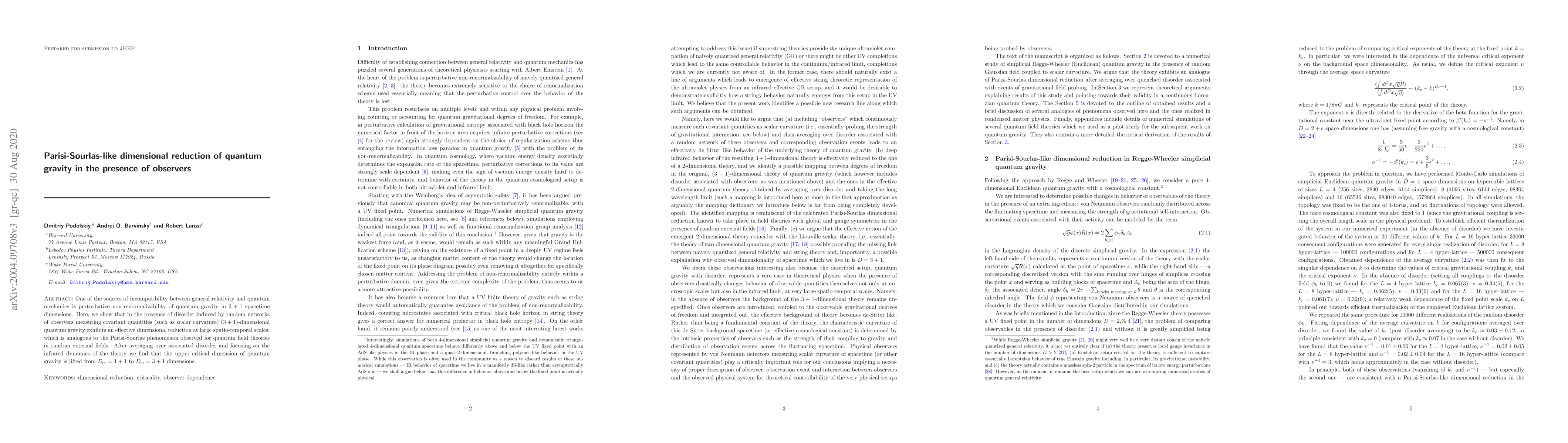 This paper demonstrates that quantum gravity in $3+1$ dimensions can effectively reduce in dimensions when influenced by random networks of observers, akin to the Parisi-Sourlas phenomenon. This dimensional reduction lifts the upper critical dimension, allowing for a consistent quantum gravity theory in $3+1$ dimensions.