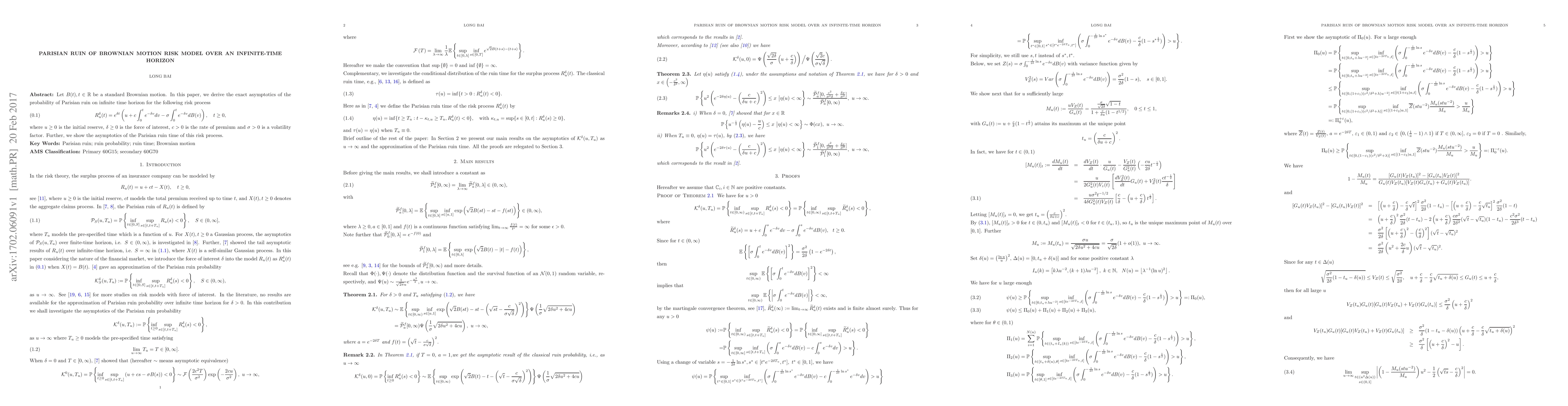 This research paper analyzes the risk model for a Parisian ruin over an infinite time horizon, finding its asymptotics with respect to key parameters like interest rate, premium, and volatility. It provides insights into the behavior of the risk process as time approaches infinity.