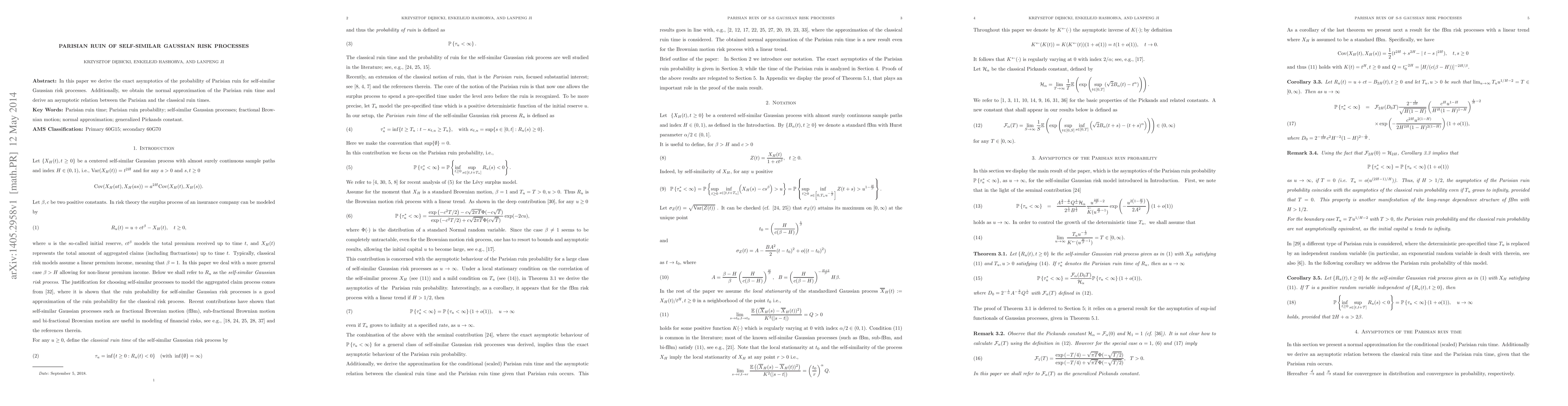 This paper derives the exact asymptotics for the probability of Parisian ruin in self-similar Gaussian risk processes and provides a normal approximation for the Parisian ruin time, alongside an asymptotic relation between Parisian and classical ruin times.
