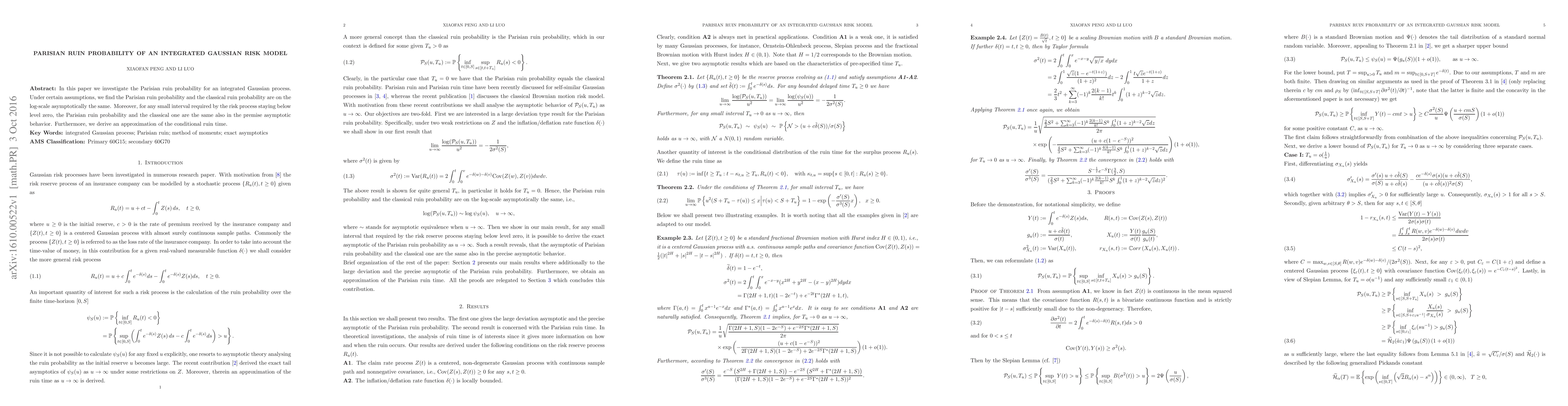 This paper examines the Parisian ruin probability in an integrated Gaussian risk model, finding that it asymptotically matches the classical ruin probability on a log-scale. Additionally, it shows that both probabilities exhibit identical behavior in small intervals where the risk process remains below zero, and provides an approximation for the conditional ruin time.