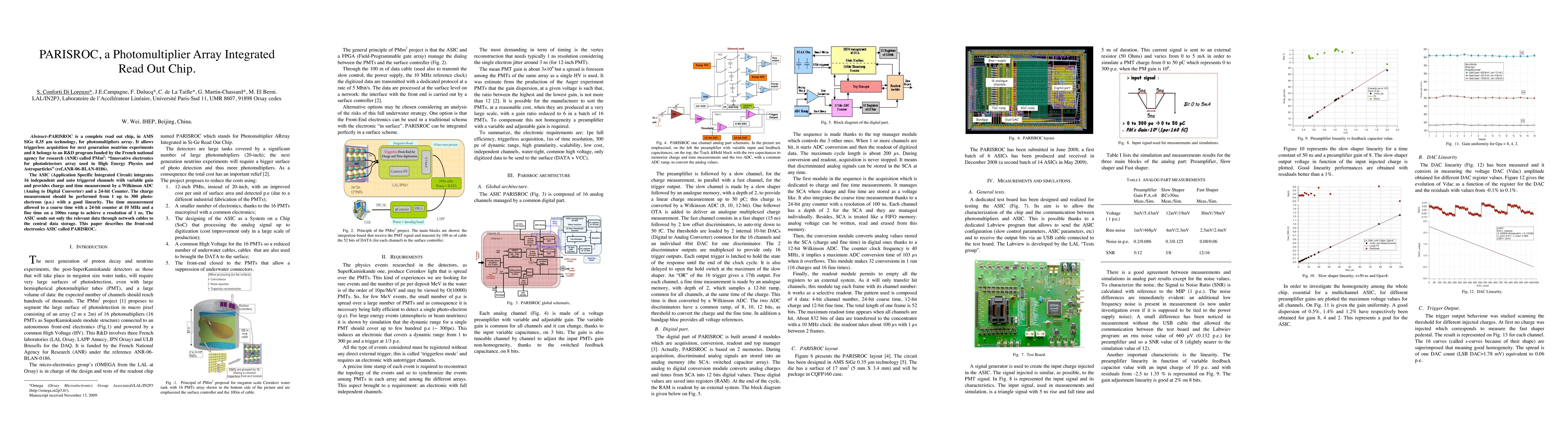 PARISROC is a complete read out chip, in AMS SiGe 0.35 !m technology, for photomultipliers array. It allows triggerless acquisition for next generation neutrino experiments and it belongs to an R&D program funded by the French national agency for research (ANR) called PMm2: ?Innovative electronics for photodetectors array used in High Energy Physics and Astroparticles? (ref.ANR-06-BLAN-0186). The ASIC (Application Specific Integrated Circuit) integrates 16 independent and auto triggered channels with variable gain and provides charge and time measurement by a Wilkinson ADC (Analog to Digital Converter) and a 24-bit Counter. The charge measurement should be performed from 1 up to 300 photo- electrons (p.e.) with a good linearity. The time measurement allowed to a coarse time with a 24-bit counter at 10 MHz and a fine time on a 100ns ramp to achieve a resolution of 1 ns. The ASIC sends out only the relevant data through network cables to the central data storage. This paper describes the front-end electronics ASIC called PARISROC.